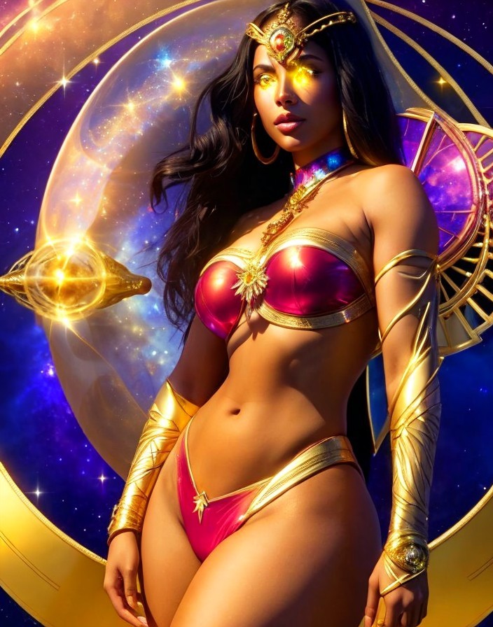 Prompt: Promethea, the magic goddess, is a stunningly beautiful being with a physique that exudes power and elegance. She stands tall at around 5'9" with a lithe yet athletic build, her curves honed from centuries of wielding her magical abilities. Her skin is a radiant porcelain-like complexion with a subtle shimmer, as if infused with the essence of the stars. Her raven-black hair cascades down her back like a waterfall of night, with subtle hints of purple and indigo that seem to shift and change color depending on the light. Her eyes burn with an inner fire, blazing like two sapphires that sparkle with an otherworldly intensity. Her features are chiseled and refined, with high cheekbones, a small nose, and lips that curve into a perpetual enigmatic smile. A delicate filigree of silver and gold adorns her ears, wrists, and throat, pulsing with a soft blue glow that seems to reflect the rhythm of the cosmos. As she moves, her very presence seems to command attention, as if the air itself responds to her magic.
