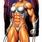 A fully detailed anime style artwork depicts a fierce, muscular female character with short, spiky white hair and piercing blue eyes. She stands confidently with a determined expression, wearing a sleek, black, form-fitting bodysuit with a black tank top over it, that accentuates her powerful physique, showcasing prominent