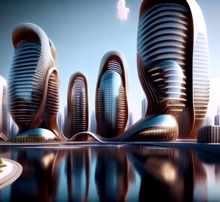 Futuristic skyline with sleek, curved skyscrapers reflected in water against a pink and blue sky.