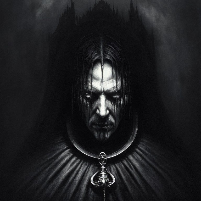Sinister fantasy character with red eyes, hooded cloak, gothic armor, dark castle, moon