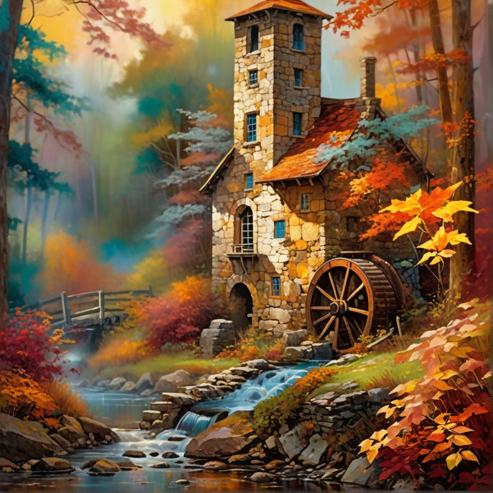 A charming stone mill with a water wheel beside a gentle stream. Surrounded by vibrant autumn foliage, the scene exudes tranquility and a sense of timeless beauty in nature.