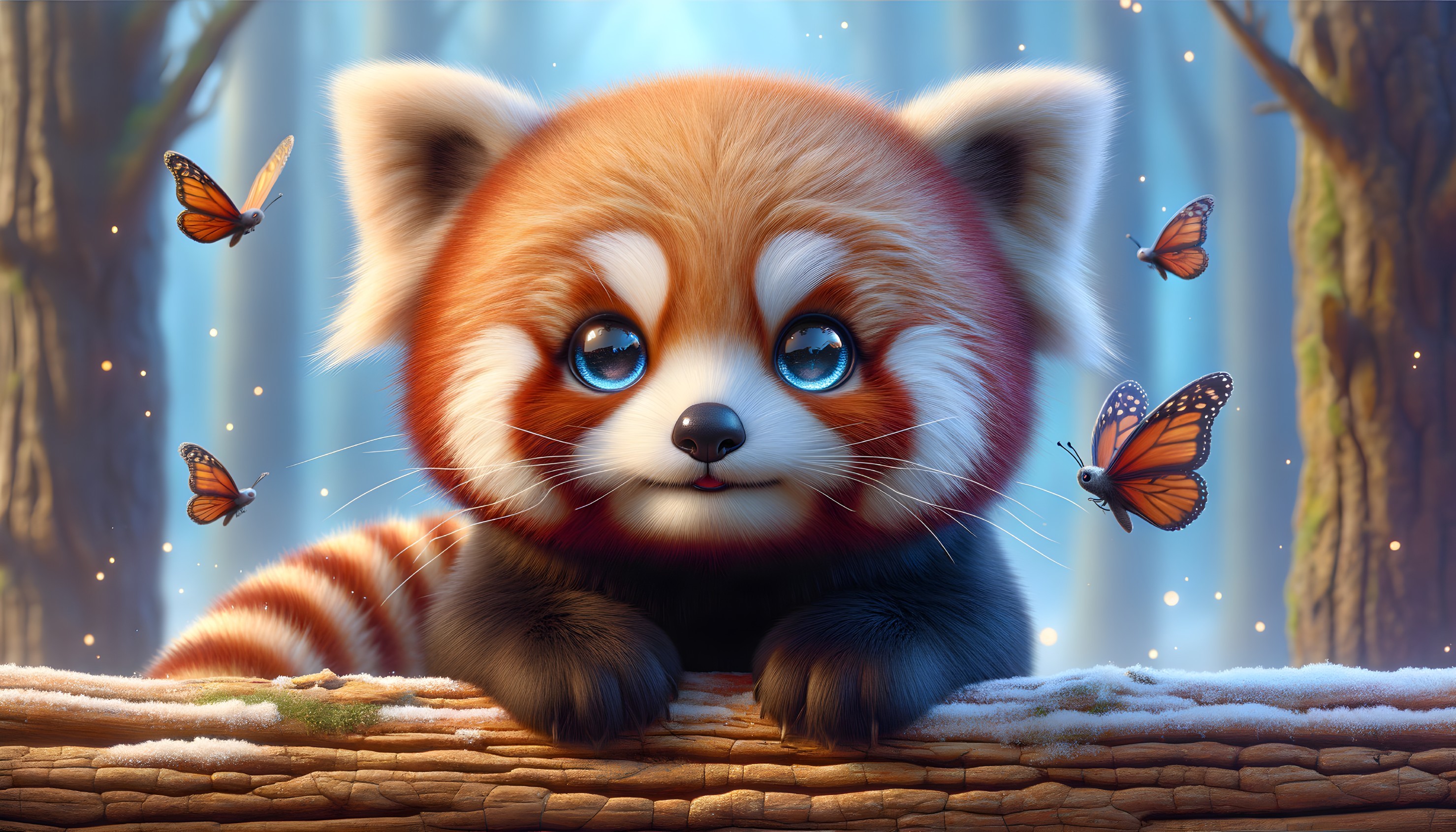 A whimsical illustration of an adorable red panda with large, expressive blue eyes, surrounded by butterflies in a magical forest setting.