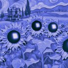 Surreal landscape with blue house and purple sunflowers