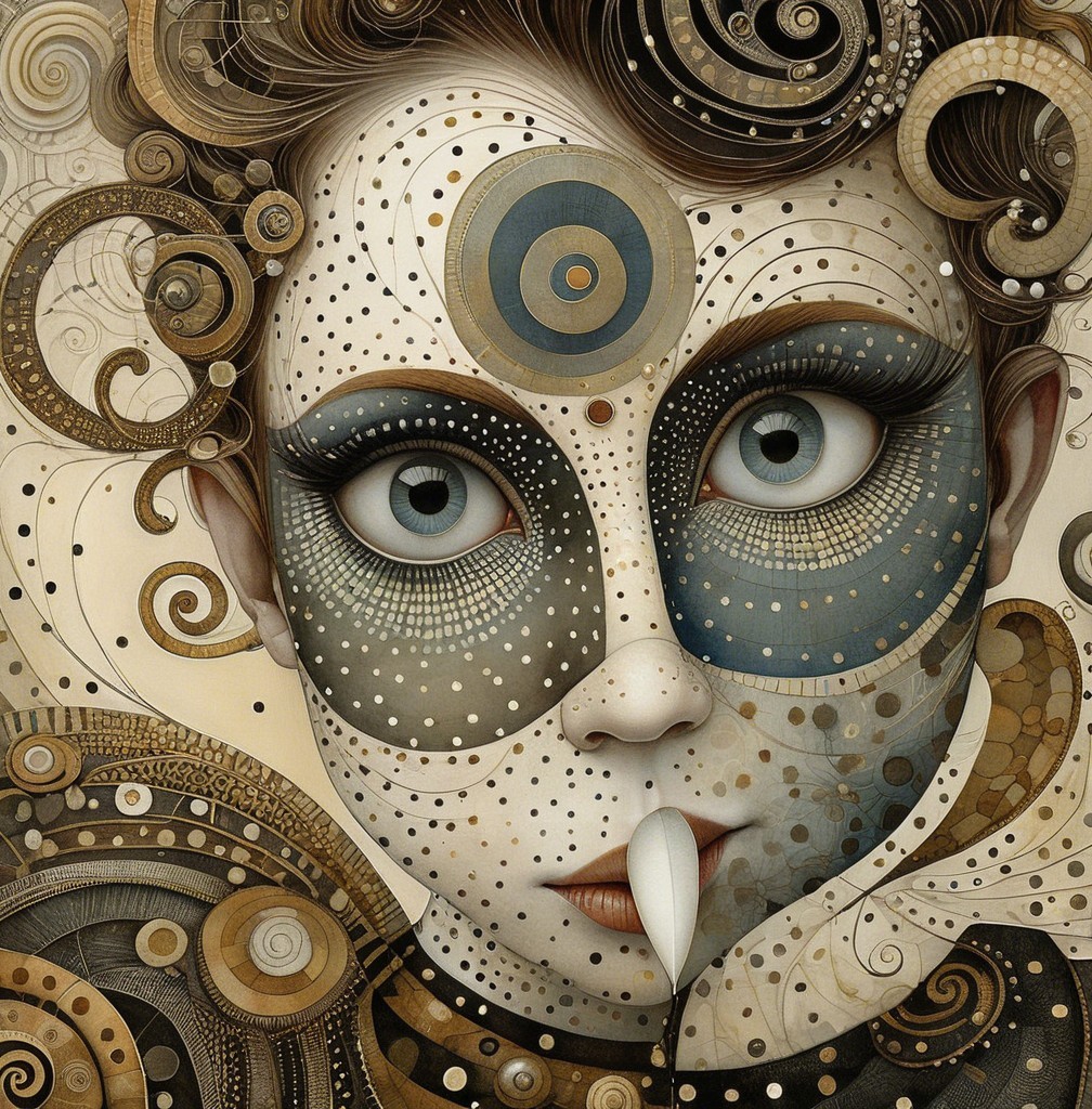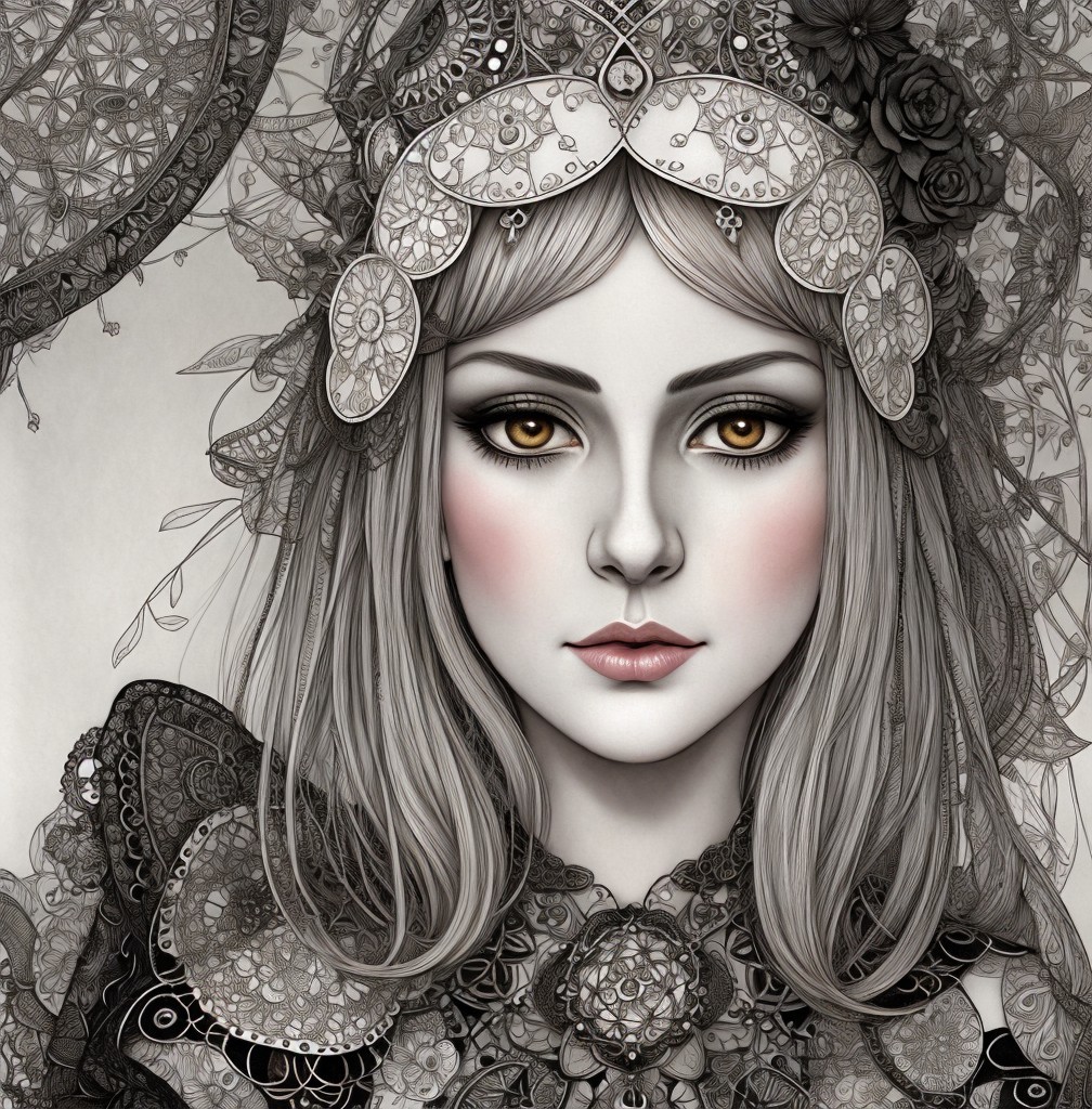 The image features a beautifully detailed portrait of a woman adorned with intricate gold and pearl jewelry, set against a soft, ornate background. Her expression is calm and enchanting.