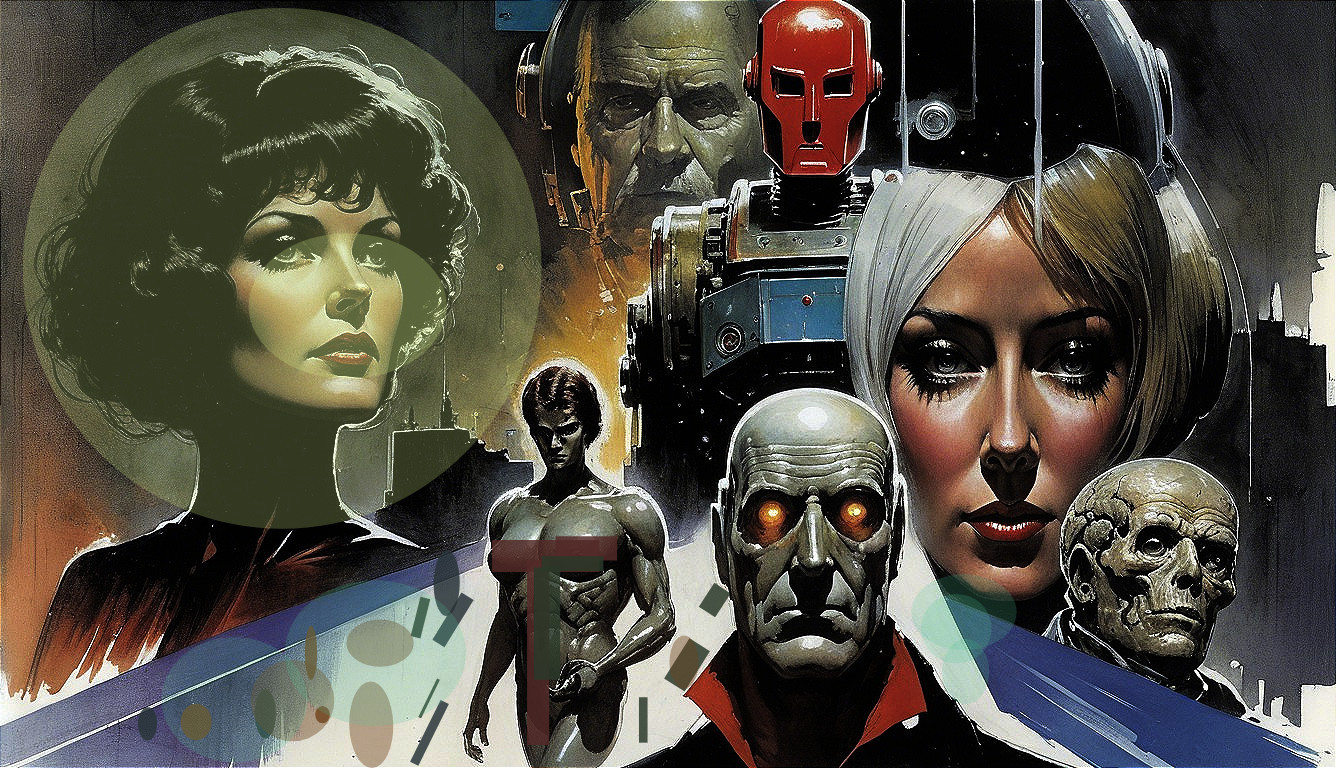 The image showcases a collage of sci-fi characters, blending human faces and robotic figures, featuring futuristic designs and dramatic lighting, evoking themes of technology and identity.