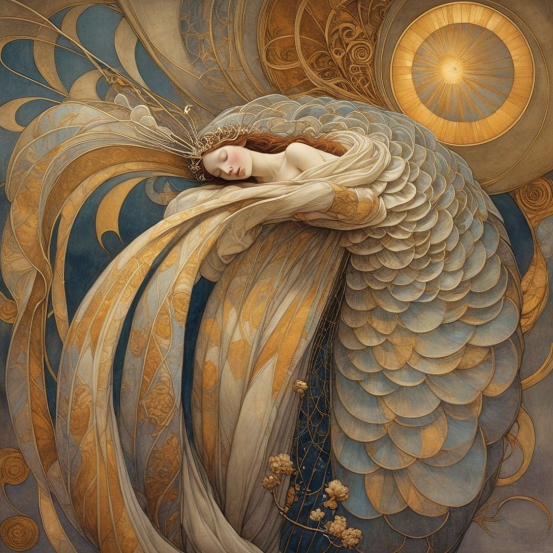 A serene figure with flowing hair and dressed in elegant, billowing garments rests gracefully against a backdrop of swirling clouds and golden circular patterns, evoking a sense of tranquility.