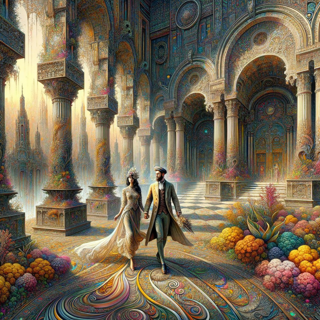 Prompt: Patchwork by Catherine Abel, Picasso, Caspar David Friedrich, Richard Dennis, Joe Fenton, Andree Wallin, Catrin Welz-Stein, Wassily Kandinsky, Thomas Kinkade, an elegant couple is walking through an elaborate garden in Rambla, Spain, elegant, line art, intricate, beautiful, fantastic view, elaborate, fractal,