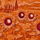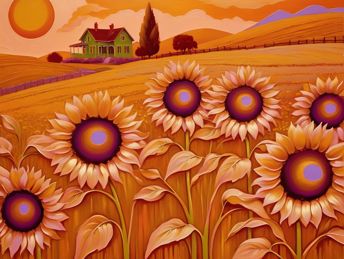 A vibrant sunset casts warm hues over a golden field, dotted with tall sunflowers. In the background, a charming green house stands, surrounded by rolling hills and a tranquil atmosphere.