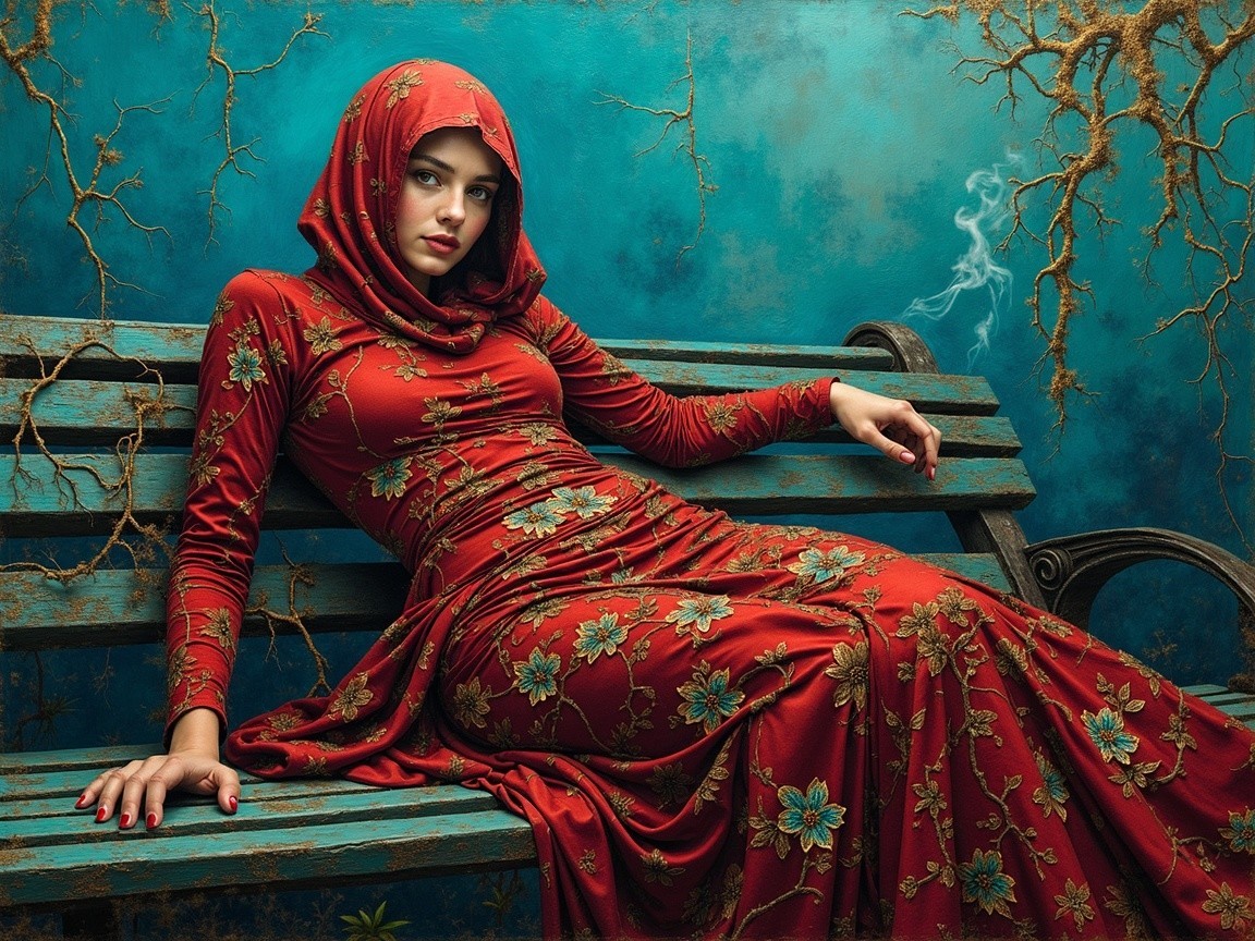A woman in a vibrant red dress with floral patterns lounges on a weathered bench against a textured, blue background. A hint of smoke curls around her, adding to the mysterious atmosphere.