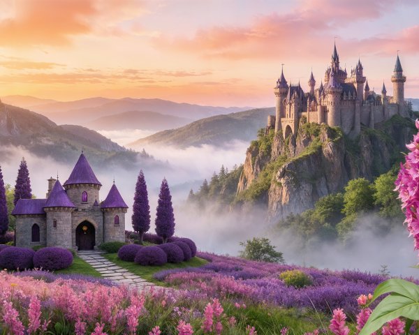 A fairytale castle with multiple towers and spires, stands on a rocky outcrop overlooking a serene turquoise lake, surrounded by snow-capped mountains and lush green forests. The foreground is filled with a vibrant array of colourful flowers, including large orange, pink, yellow, and red roses, and clusters of smaller
