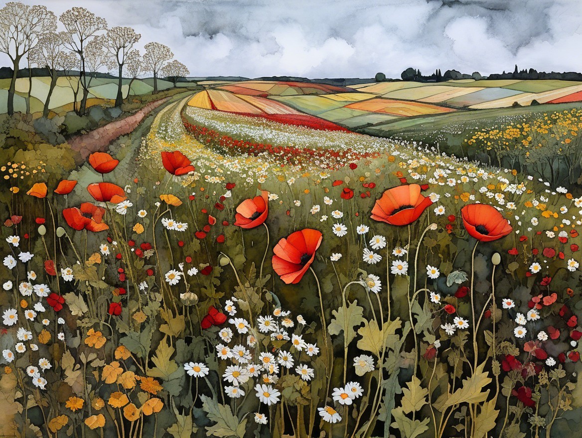 A vibrant landscape features rolling hills adorned with colorful fields of poppies and daisies, set against a moody sky. Natural beauty and contrasting colors create a serene atmosphere.
