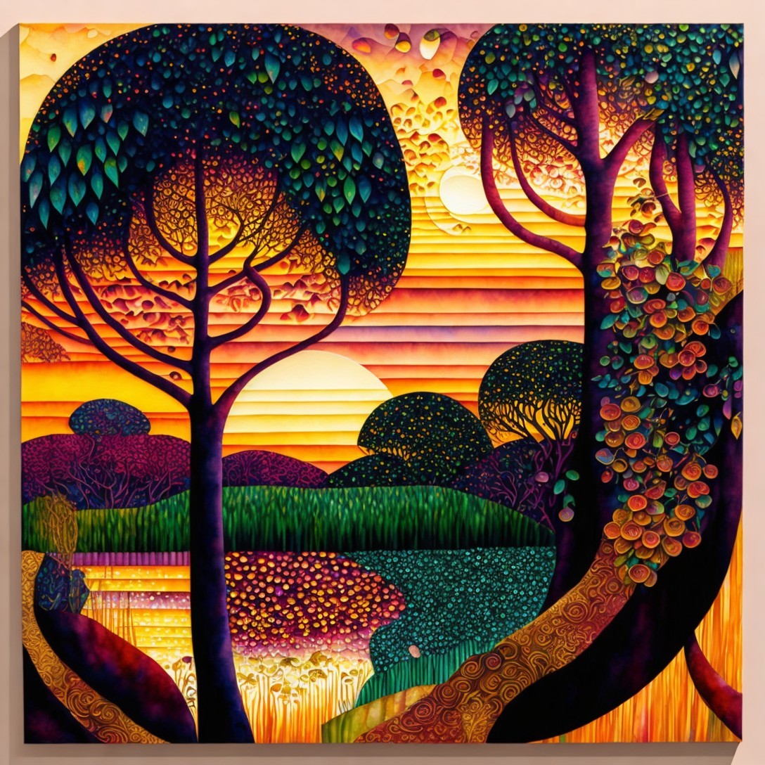 A fantastical landscape with a vibrant, sunset palette, consisting of deep oranges, reds, purples, and blues. The background features a stylized sun setting behind rolling hills with gradient stripes of color, ranging from yellow to dark red. In the foreground, two prominent, whimsically shaped trees with thick trunks and circular foliage occupy the left and right sides of the image, their leaves a mosaic of dark greens, teals, and blues with highlights suggesting individual leaves. The tree on the left side has a rounder canopy with intricate branch patterns visible inside, while the right tree has a more vertical orientation with dense leaf clusters creating a rich texture.
