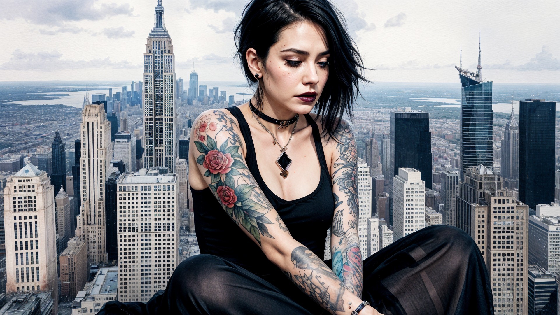 A tattooed woman in a black dress sits pensively against a vibrant cityscape, with skyscrapers and the Empire State Building in the background, evoking a blend of urban and artistic vibes.
