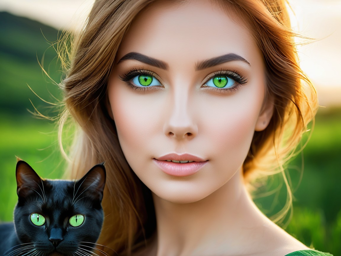 A young woman with striking green eyes stands in a lush landscape, gently cradling a black cat beside her. The scene is vibrant and serene, highlighting a bond between them.