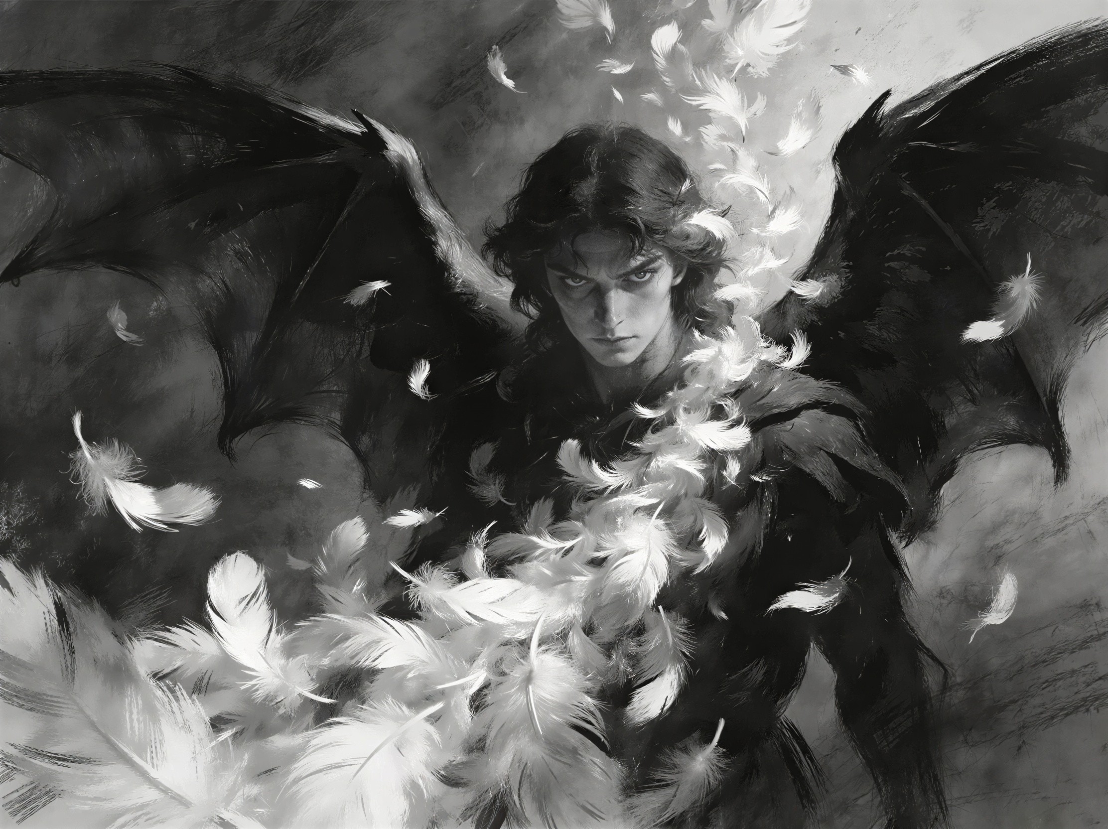Monochromatic digital painting of a dark-haired archangel, with large black wings outstretched, facing the viewer with intense light green eyes and a serious expression, surrounded by a swirling cloud of white feathers. The image is rendered with a painterly effect.