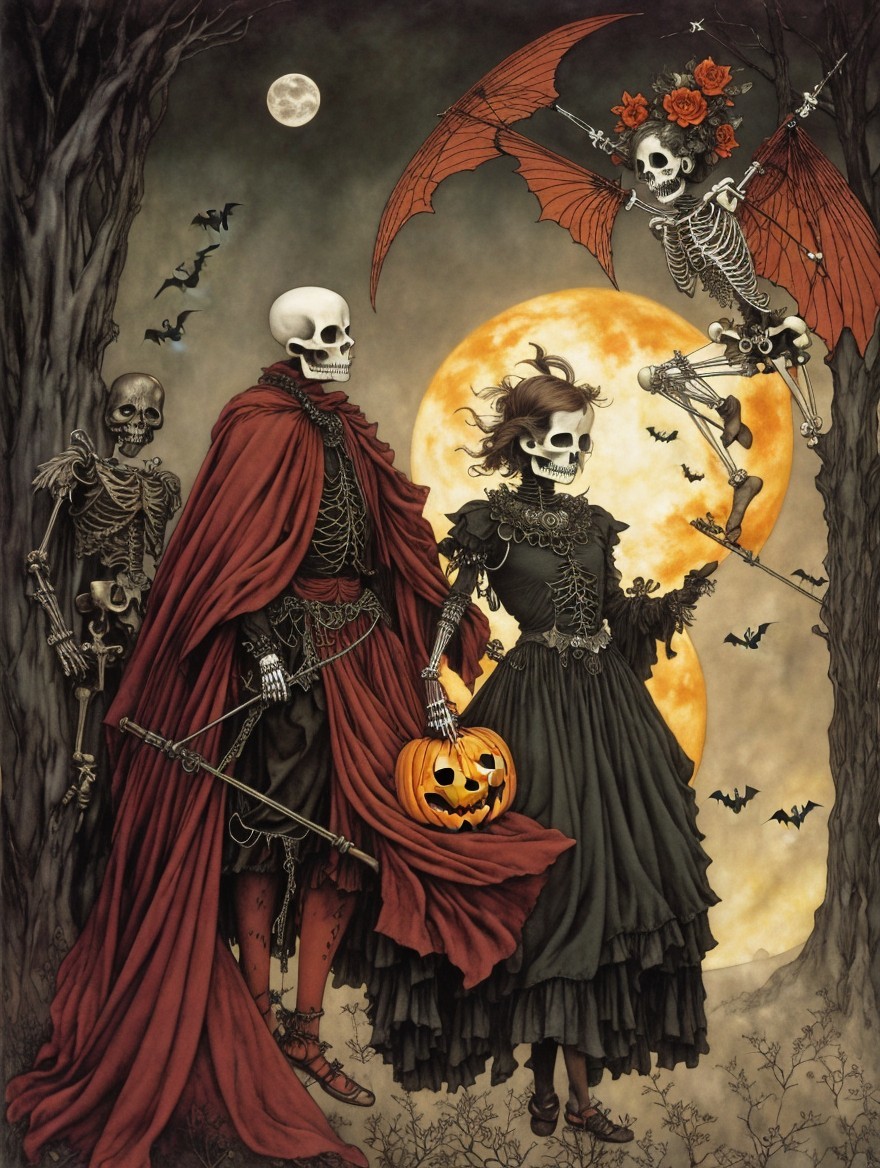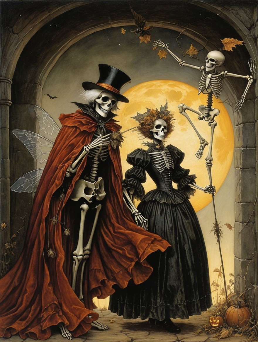 Two skeletons, one dressed as a witch with a pointy hat and broom, and the other as a fairy with wings, stand against a full moon. Jack-o'-lanterns and a spooky landscape add to the Halloween vibe.