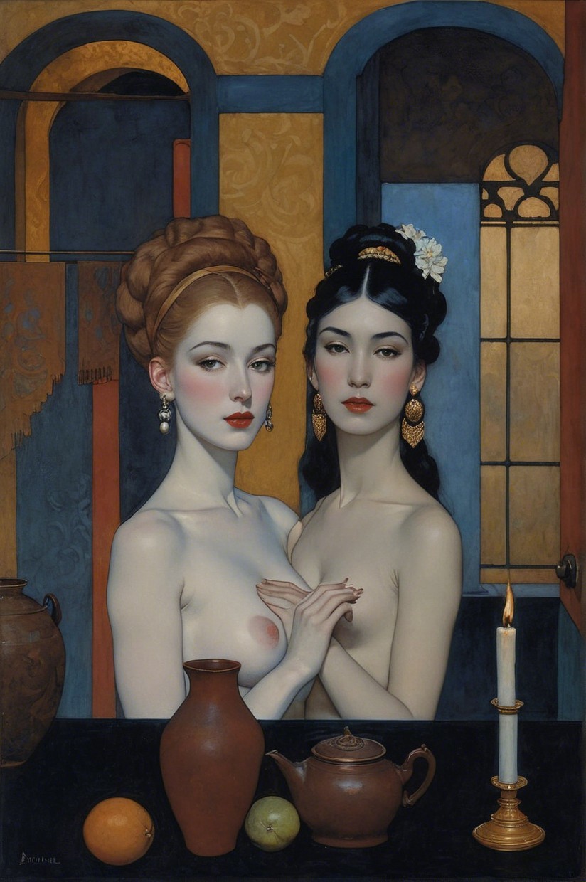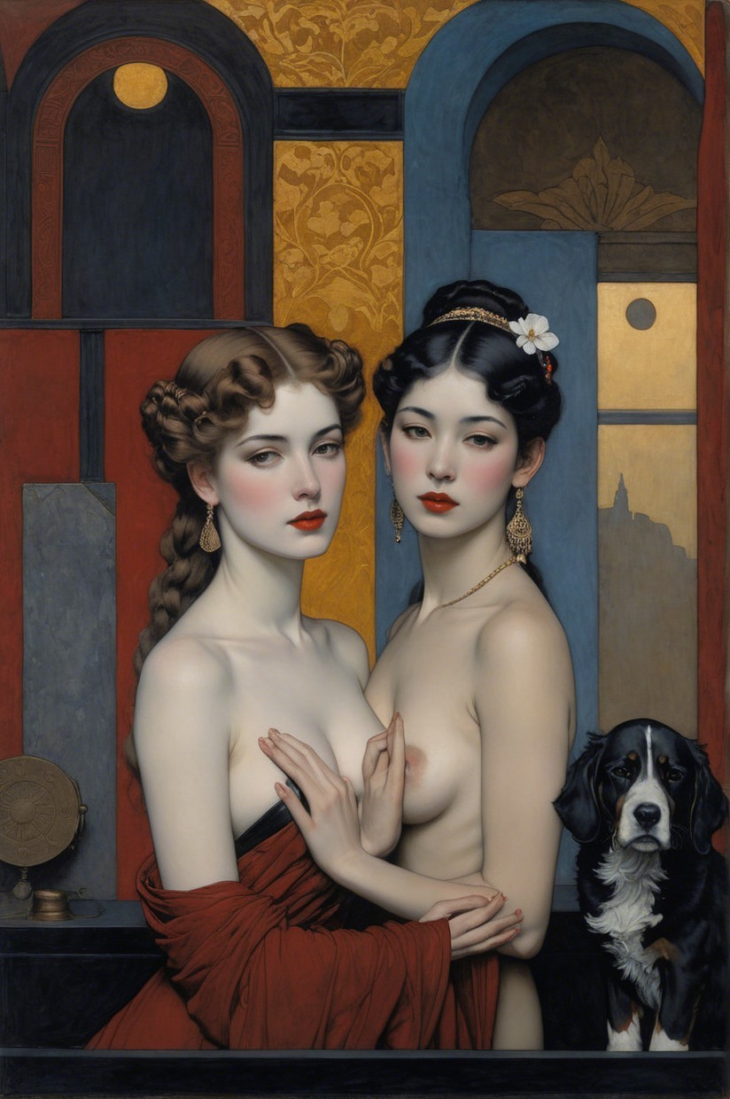 A serene woman with long, flowing hair sits gracefully by a window overlooking the moonlit ocean. Dressed in a soft, flowing white gown, she exudes a mystical, ethereal aura under the glowing moons.