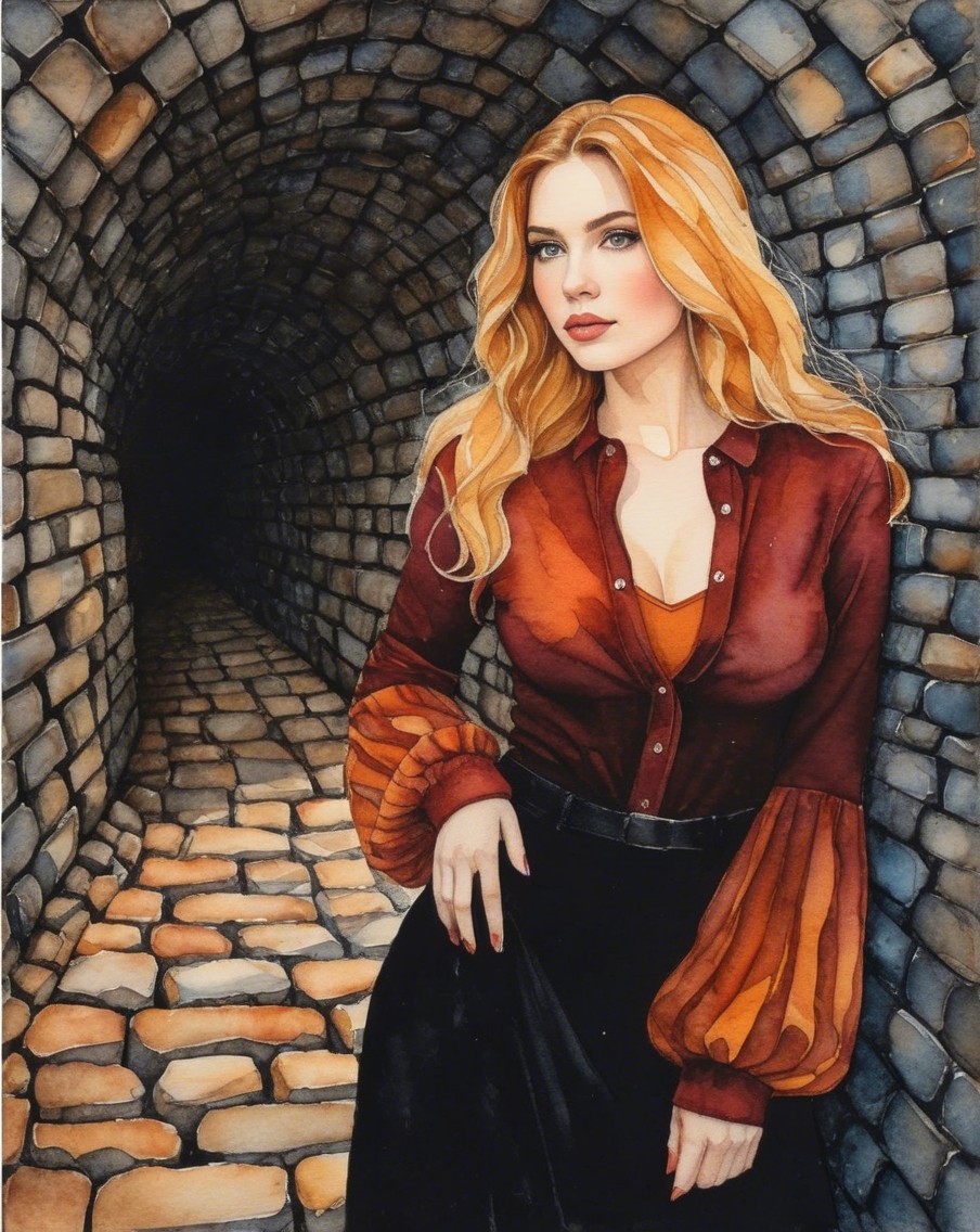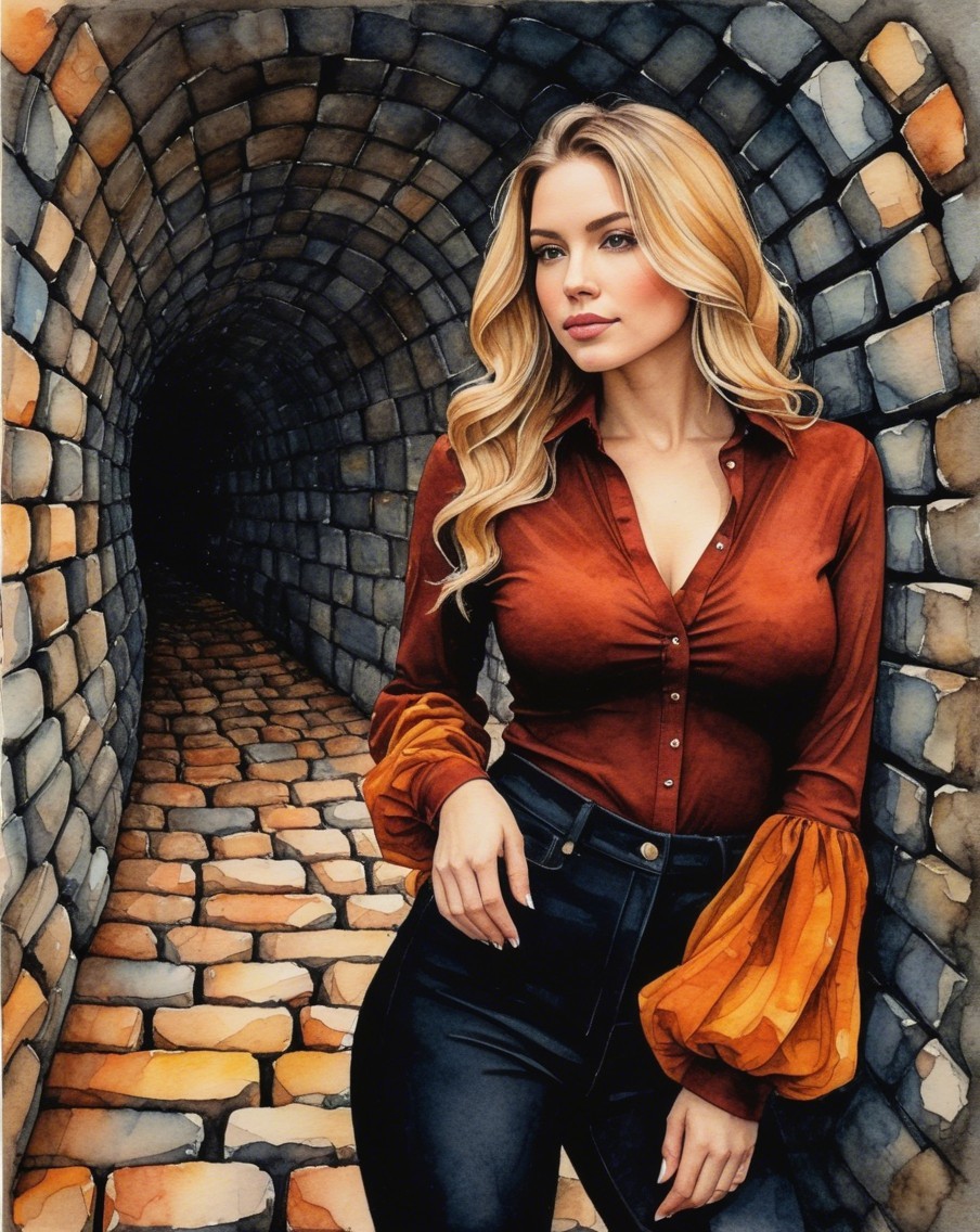 Prompt: Watercolor and ink.3/4 body Female Portraiture, multi-layered devilish eyes, tunnel with stone bricks, irregular coarse ink strokes, squiggly, Impressionistic whimsical sparkly Zentangle art style, pen and ink, overlaid with watercolor, zentangle design, highly detailed, natural lighting, contrasting warm toned colors, plasticity 1.3, simplistic ambiance, artistic interpretation. Her wide, expressive eyes shimmer with emotion, adding depth to her serene yet melancholic presence. The piece combines intricate details with bold textures, evoking a sense of mystery and enchantment, crisp realism, precise gelsculpt 64K, UHD, HDR, reminiscent of Ho Baron's mesmerizing paintings with intricate linework and layered stylized patchwork. The artwork exudes a plasticity that blends beautifully with a tessellated design, creating a stylized lineage illustration. The piece incorporates gouache details reminiscent of Gwen John's style, 3D effects for added depth. The portrait is darkened, set against a textured background, reminiscent of American Gothic art but with a unique stylized fractalization, use of golden oil paint adds a shiny texture. novelty architecture, american gothic touch, gradient inking colors, warm colors, ink and pen, acidic wash, pastel tones accents, luminism effects, luminous 3D effects 1.8, tints by Frank Miller, wet-on-wet painting in estranged metallic colors curated by David Graeme Baker, dark Gothical fantasy realm with visible textured, multi-layered eyes and sculpted elements, baroque aesthetics, cel-shaded mixed media collage approach, piercing eyes, a gaze that conveys serenity, joyful dreamlike watercolor aesthetic with squiggly patterned lines, tall details, plique-à-jour technique, cymatics, fractal effects, fissured hues. whimsical shapes, steampunk collage approach, swirling patterns of light and vivid colors. Ink splashes and textured layers heighten the surreal and introspective mood, blending vivid beiges, golds, muted greys. brightness 1.3
