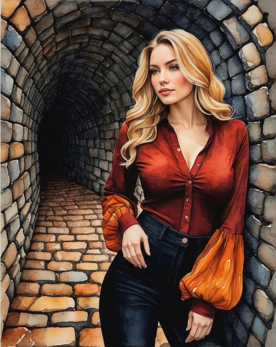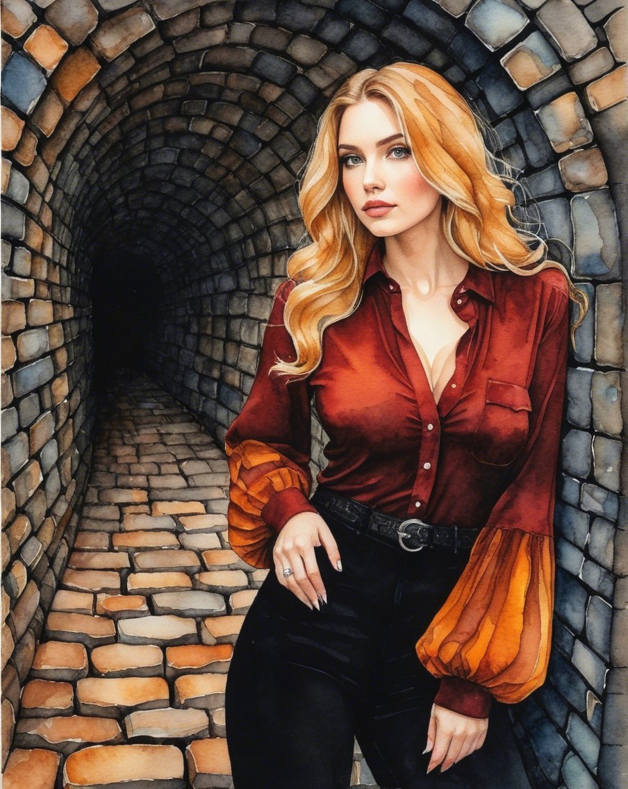 The image features a woman in a stylish red blouse and black pants, standing confidently in a stone tunnel. The play of light highlights her wavy hair and serene expression, creating a captivating contrast.