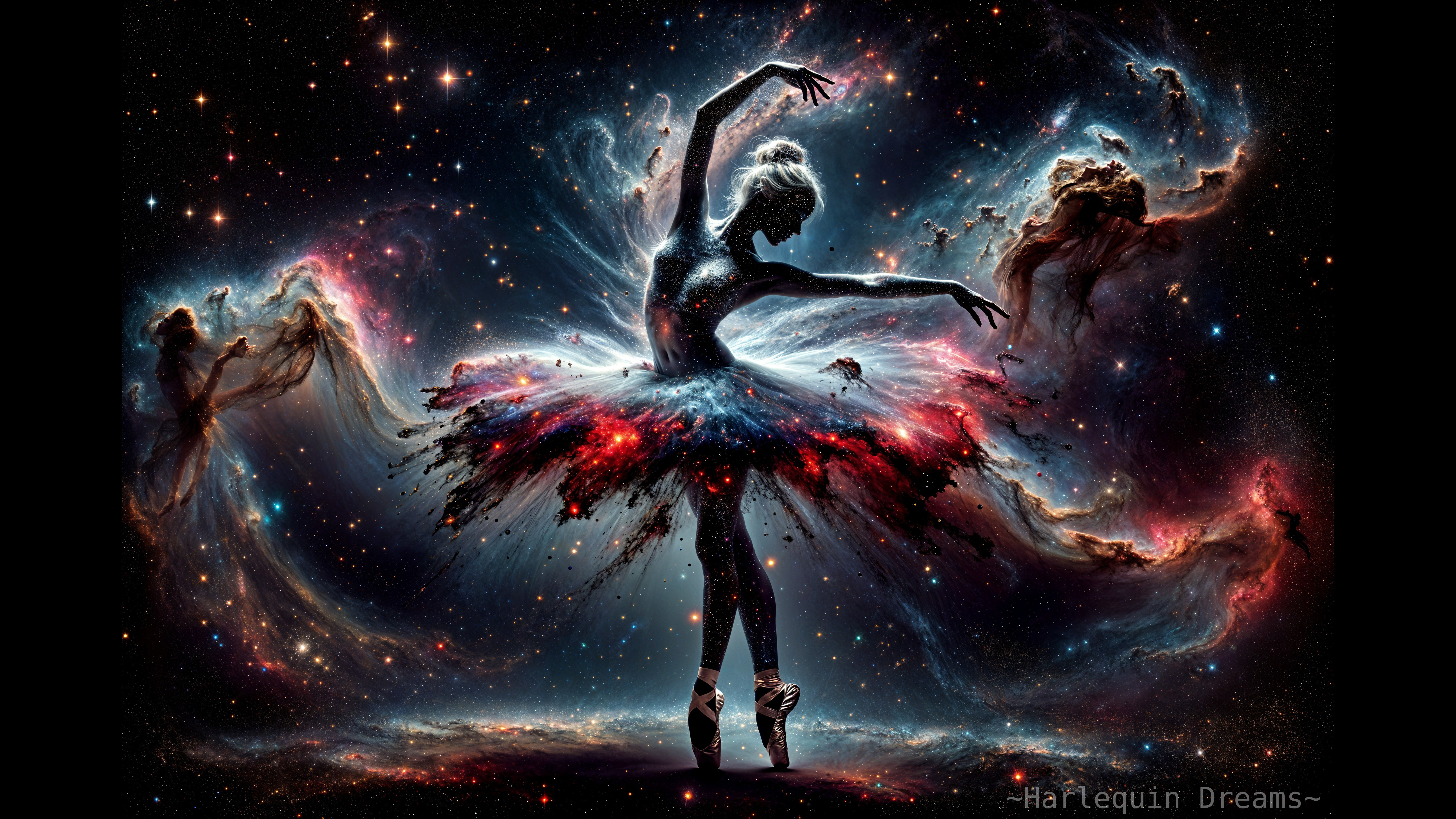 A cosmic ballerina dances amidst a vibrant, swirling galaxy, her tutu resembling a nebula, while ethereal figures gracefully emerge from the stardust, creating a dreamlike celestial scene.
