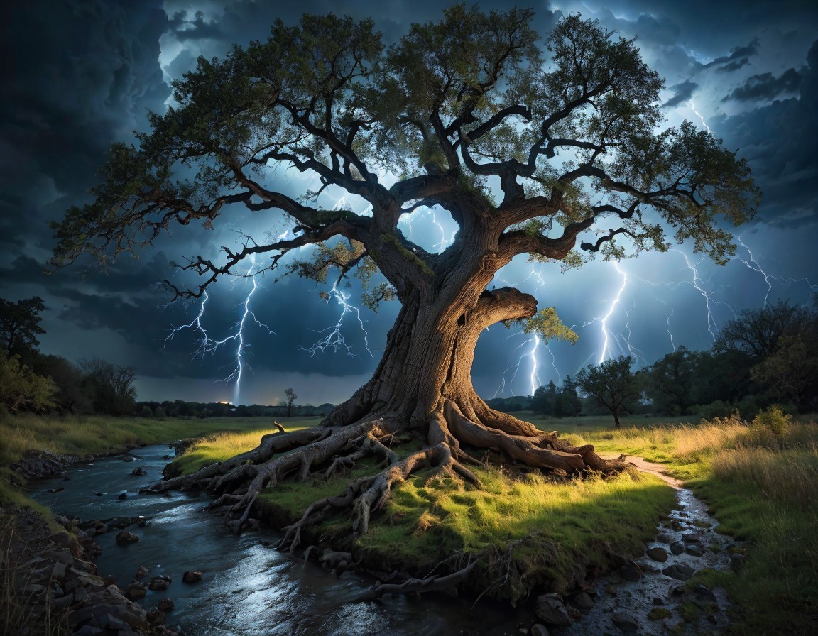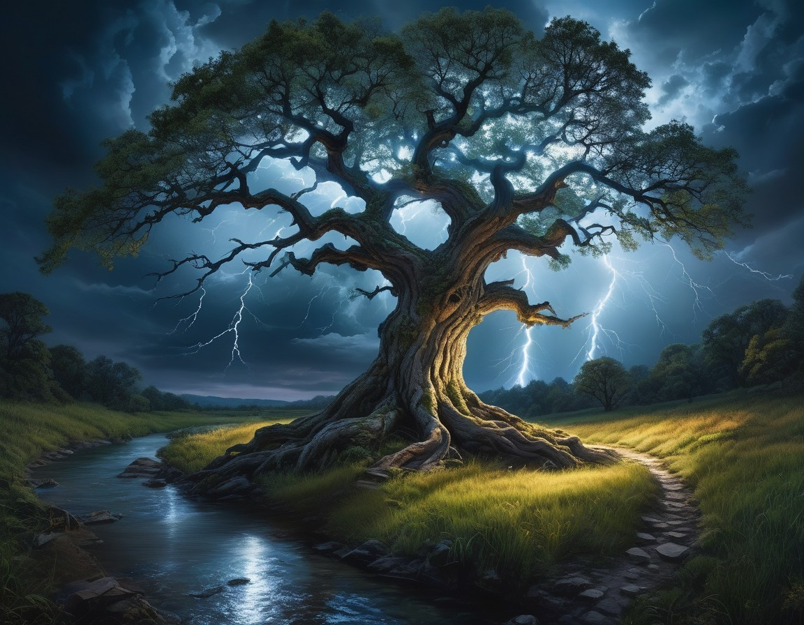 Prompt: National Geographic photo of a mighty old elm tree blown by a mighty wind, as a lightning storm in the distance approaches. A pathway to the right, a flowing river to the left of the picture.