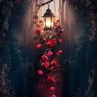 A woman in a flowing red dress stands amidst vibrant roses in a mystical forest. Soft light filters through the trees, creating an enchanting, dreamlike atmosphere.