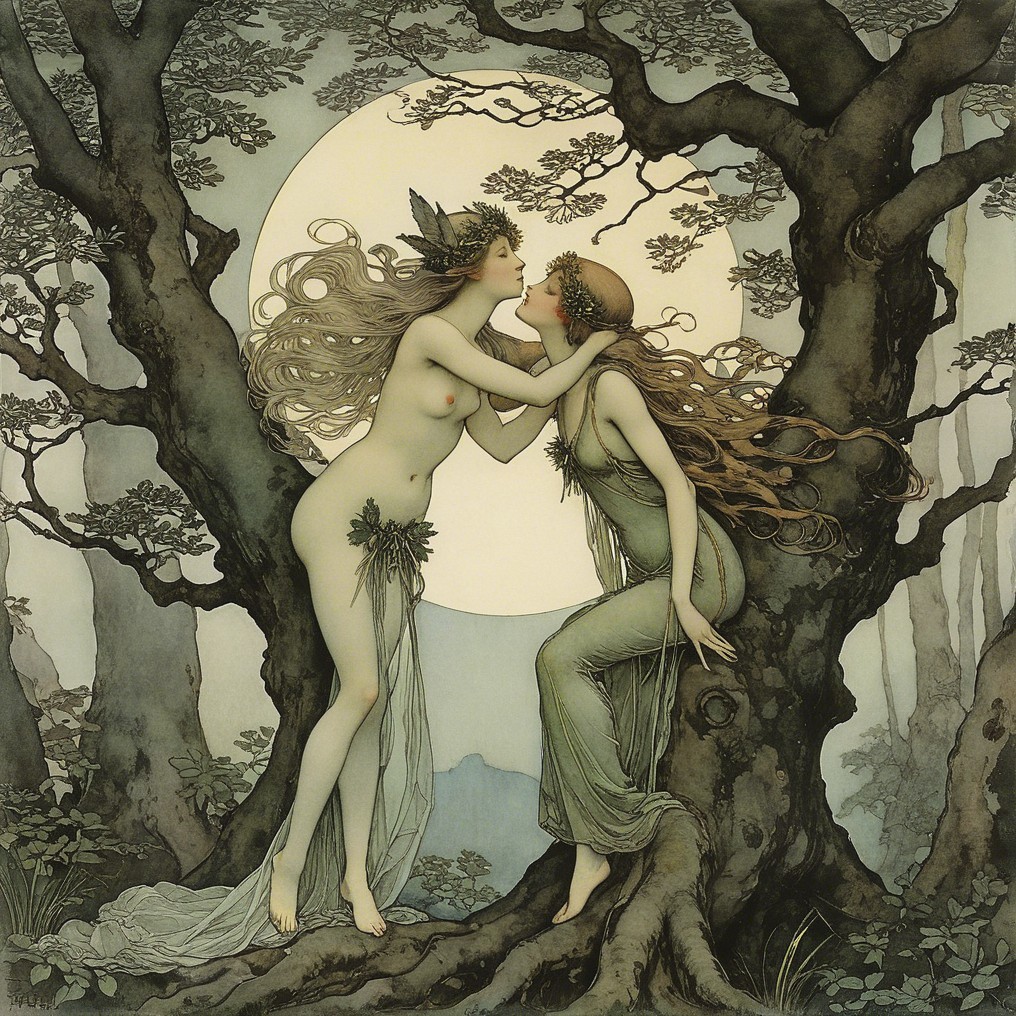 A mystical woman with flowing hair stands gracefully against a tree, dressed in ethereal fabrics. The scene is illuminated by a full moon, surrounded by a serene forest atmosphere.