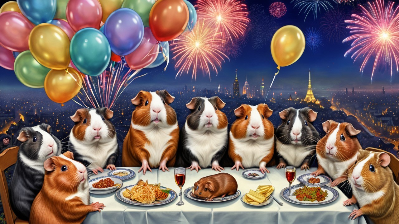 A whimsical new year dinner scene featuring guinea pigs at a festive table, surrounded by balloons and fireworks, celebrating with food and drinks against a night city skyline.