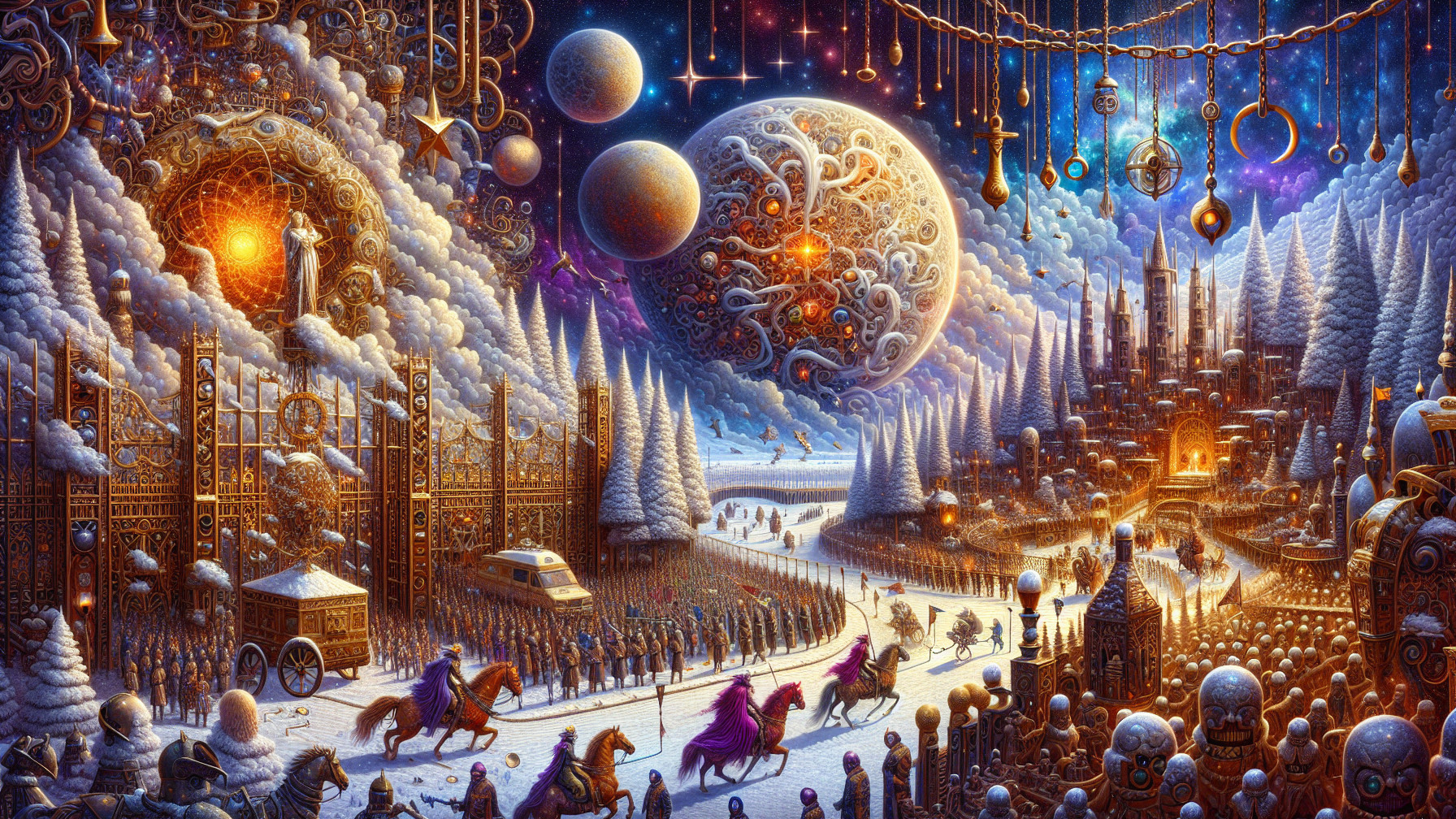 Ornately detailed fantasy landscape with a grand parade, snowy ground, and fantastical elements. In the foreground, people, some with large, round, pale blue heads, watch a procession. The procession includes riders on horseback, some with purple and pink manes, a golden carriage, and a crowd