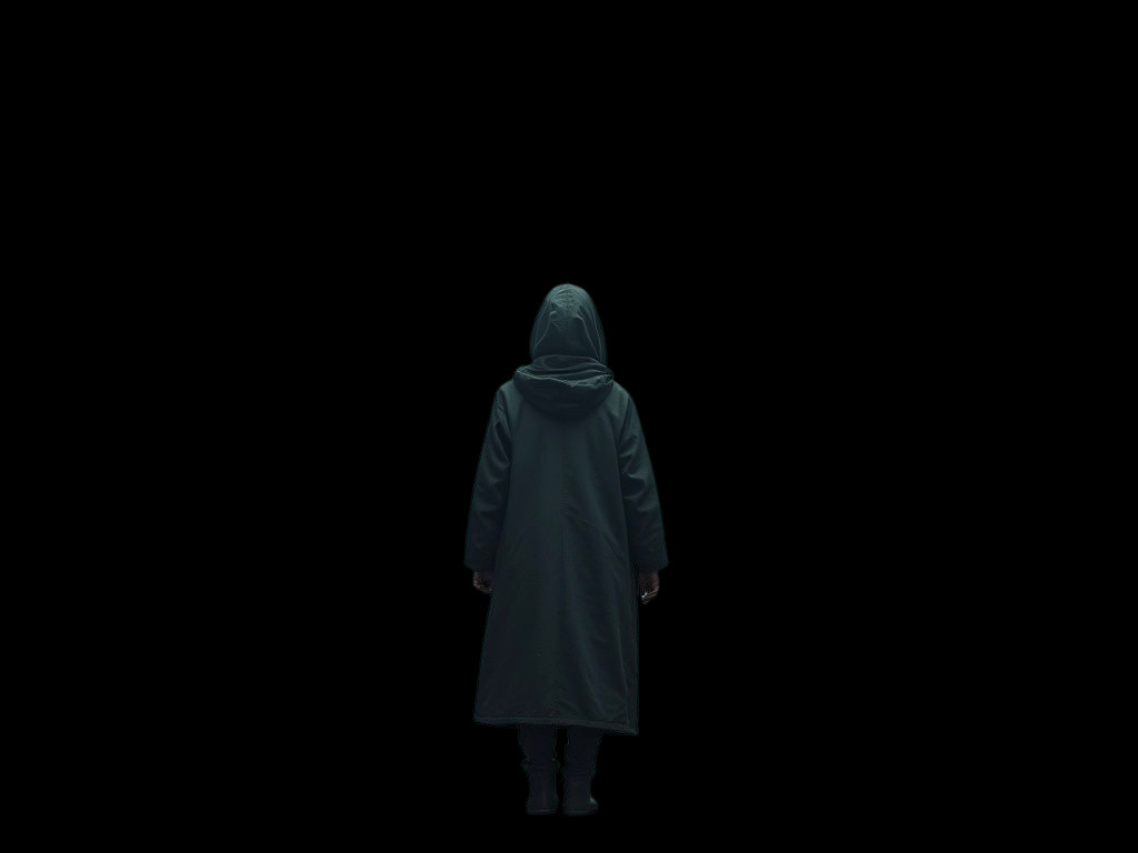 A lone figure stands in a dark, empty space, wearing a long hooded coat. The overall atmosphere is eerie and mysterious, emphasizing isolation and contemplation.