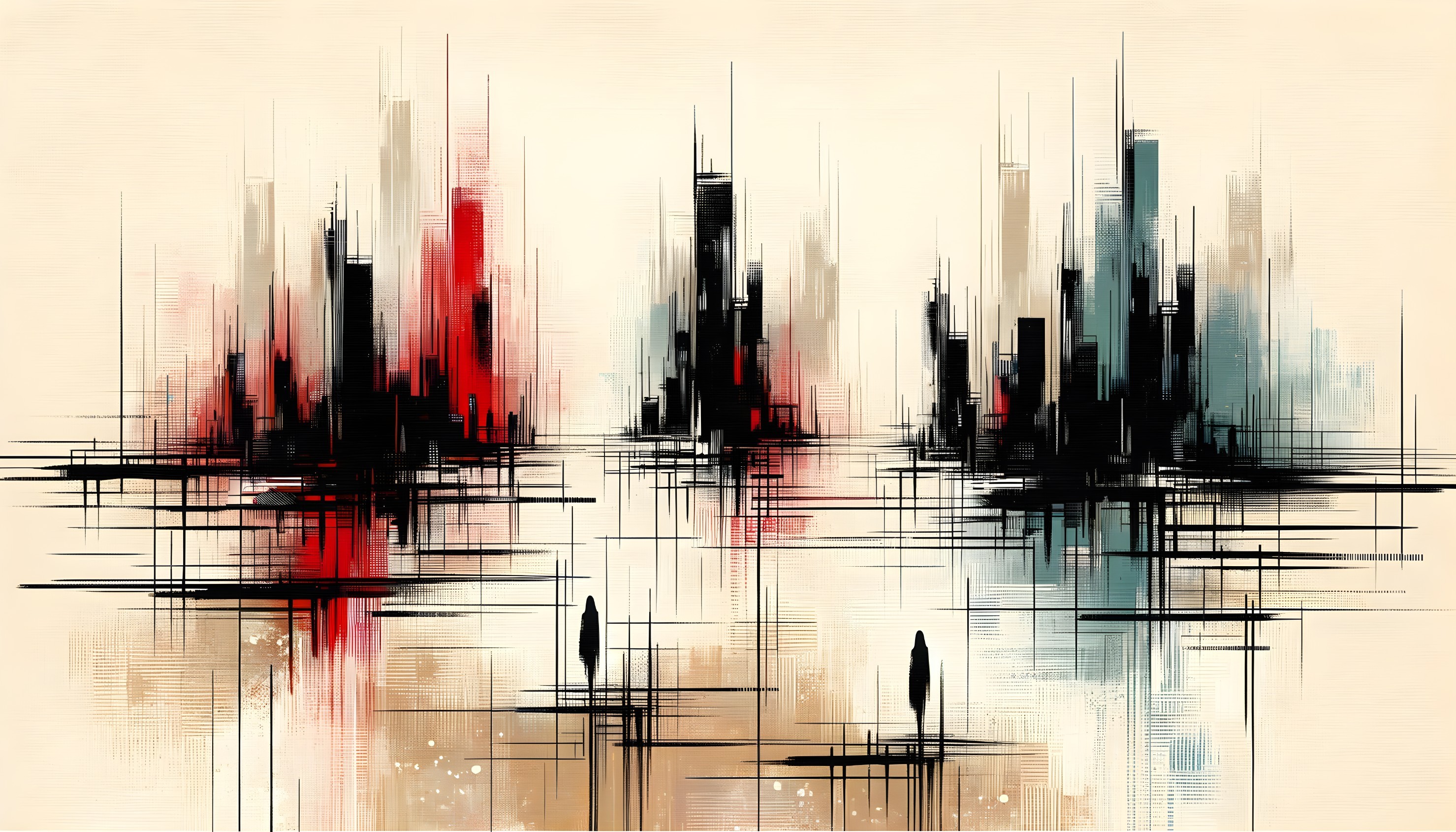 Abstract cityscape with vertical strokes in red, blue, and black, with reflections on a pale background suggesting water.