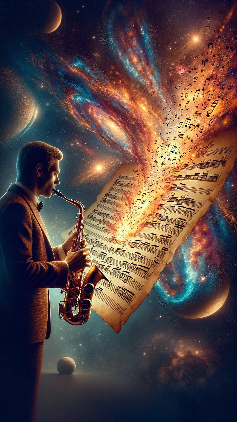 A stylish figure plays a saxophone, surrounded by a cosmic backdrop. Musical notes and sheets emerge, blending with vibrant colors and swirling galaxies, creating a surreal, dreamlike atmosphere.