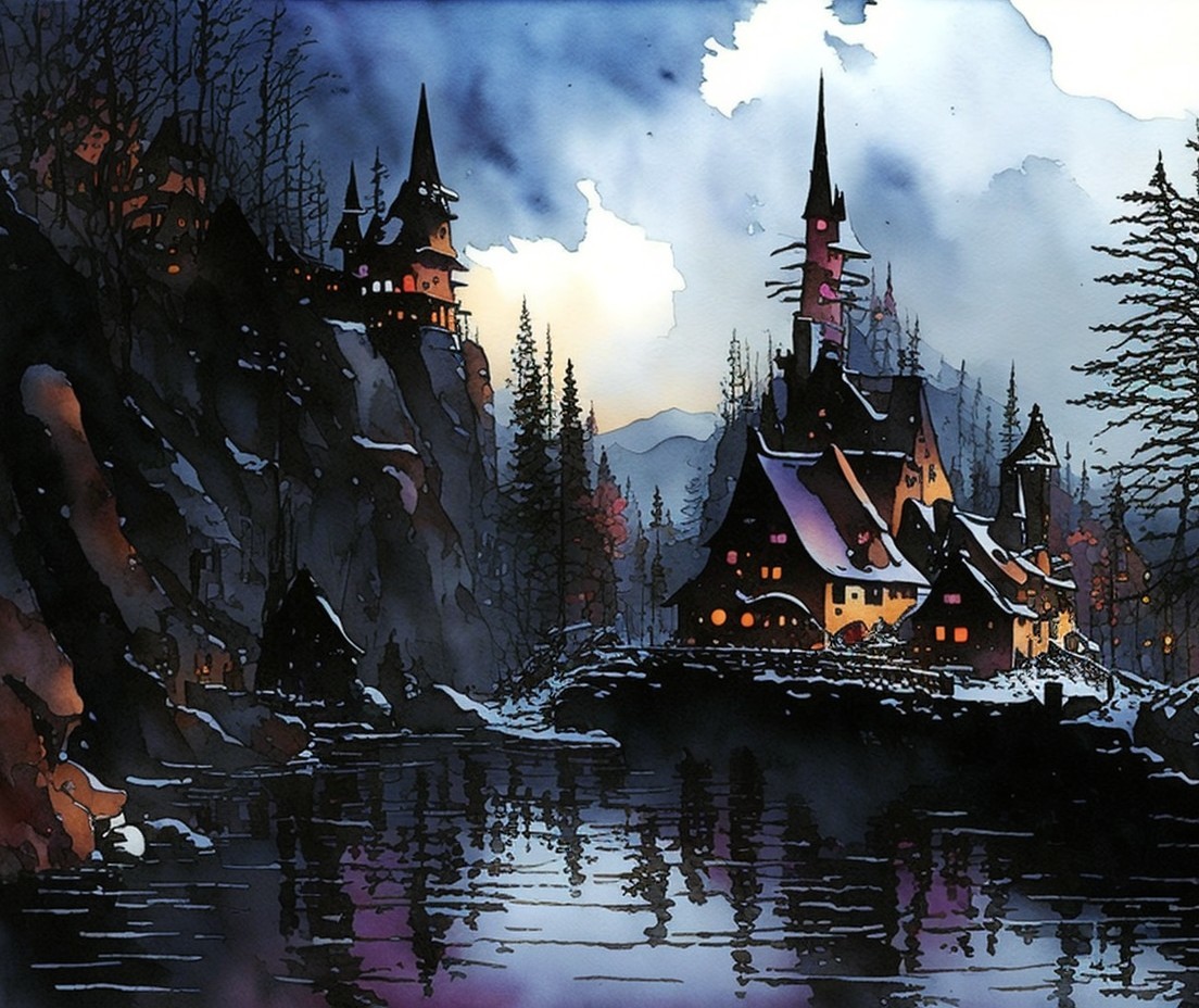 A whimsical watercolor of a nocturnal village with illuminated windows, spired rooftops against a moonlit sky, and shadowy trees. Developed from own image.