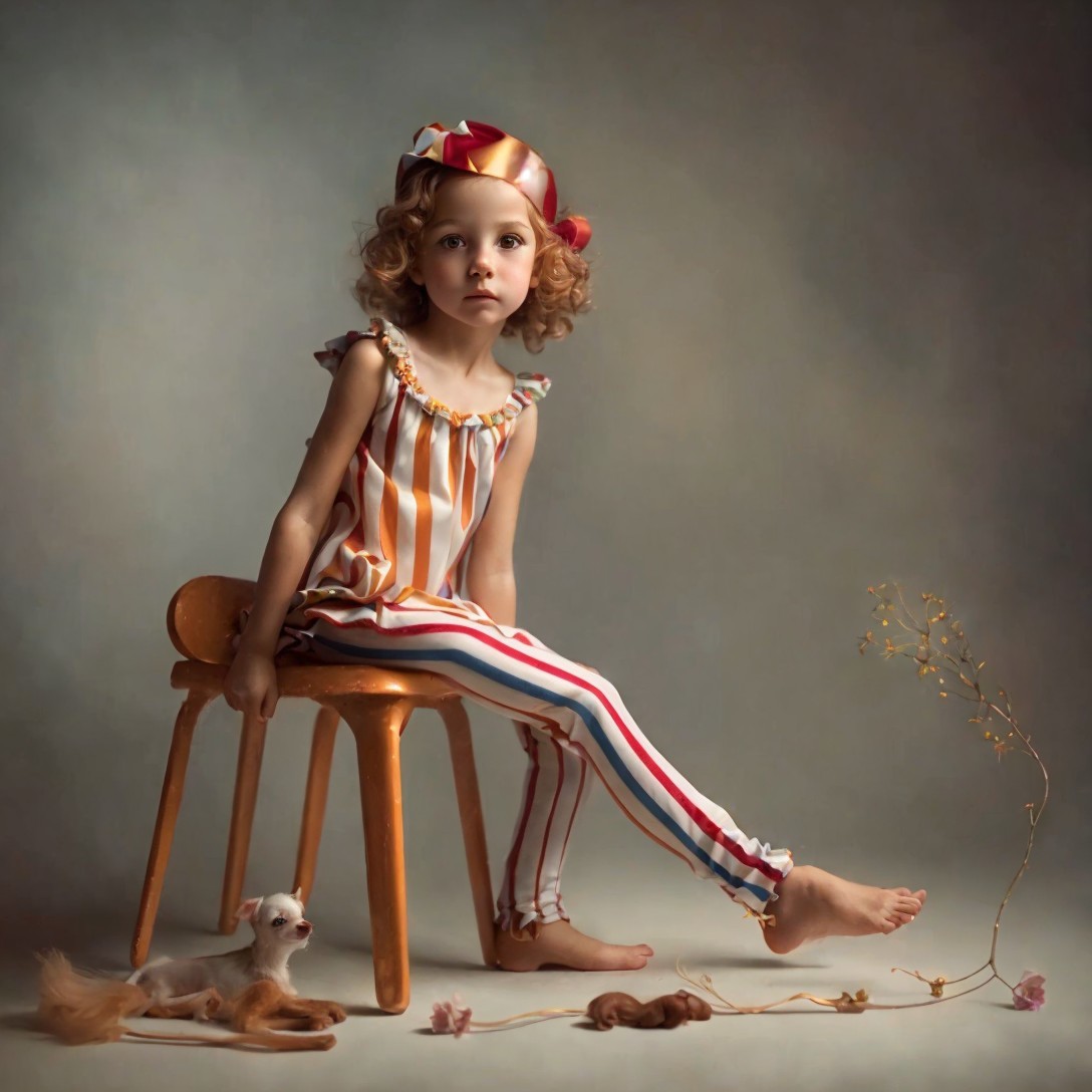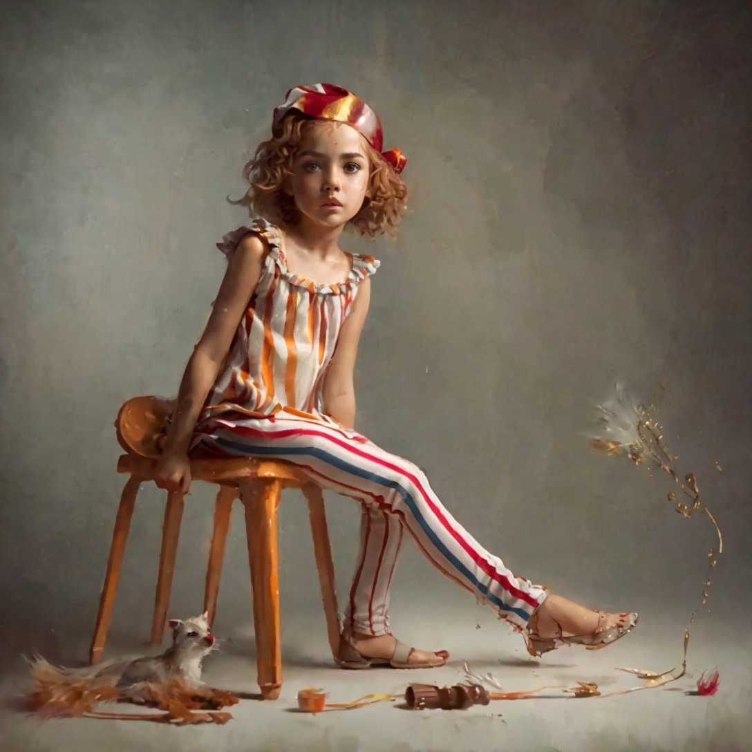 A young girl with curly red hair sits on an orange chair, wearing a striped outfit. She looks contemplative, surrounded by scattered paint and broken pieces, conveying a sense of innocence and curiosity.