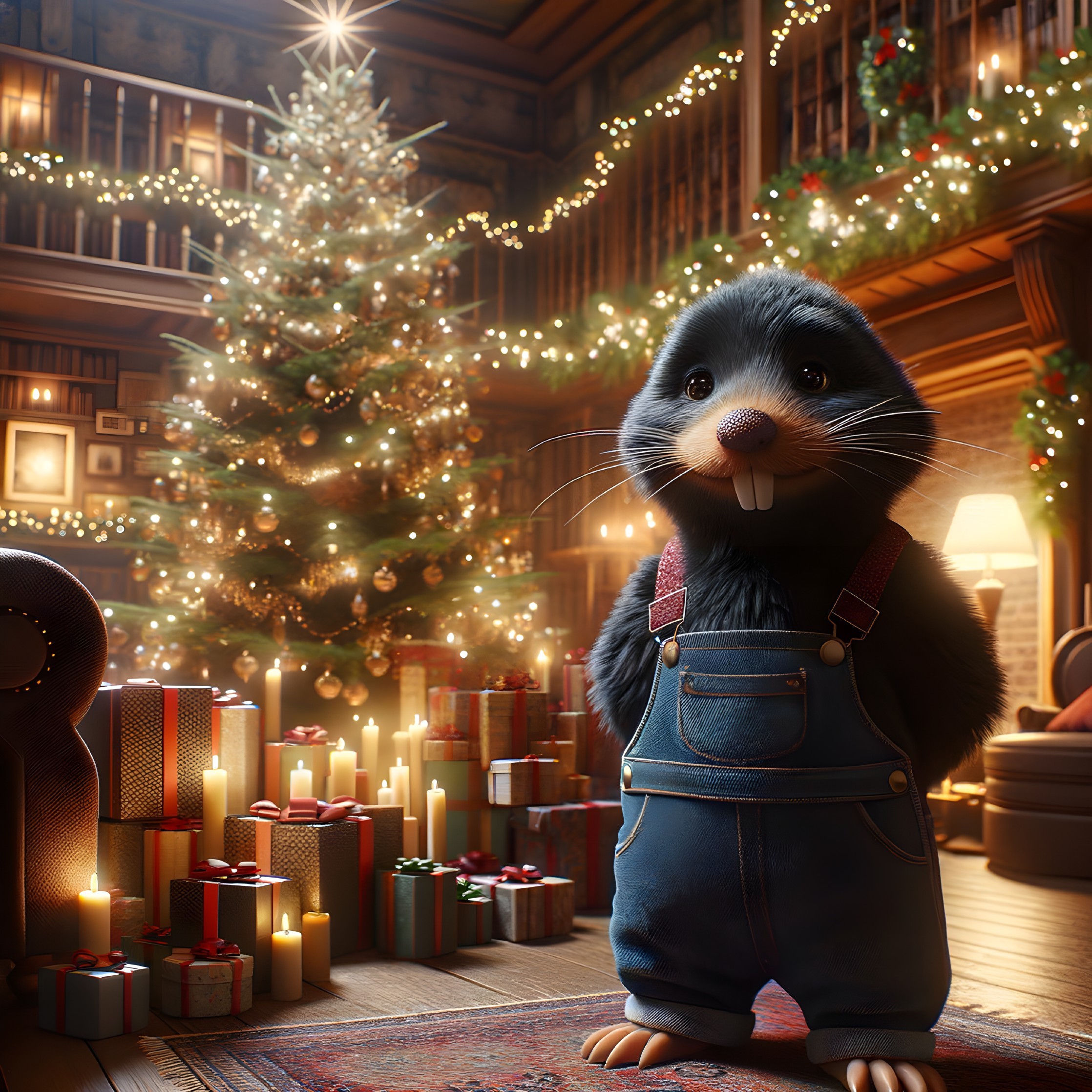 A cute cartoon mole in denim overalls stands in a cozy, festive library. A beautifully decorated Christmas tree and stacks of presents surround him, with candles flickering warmly.