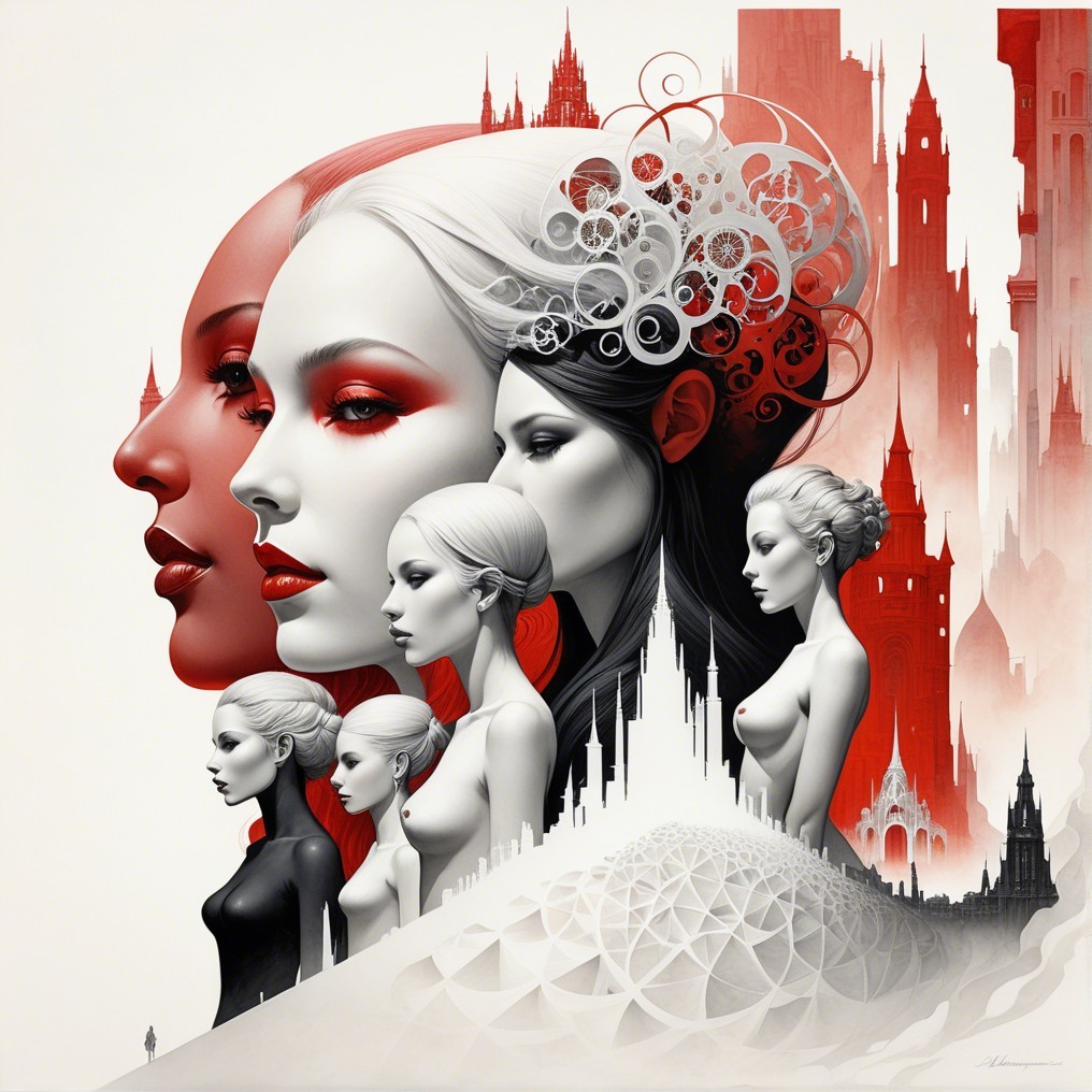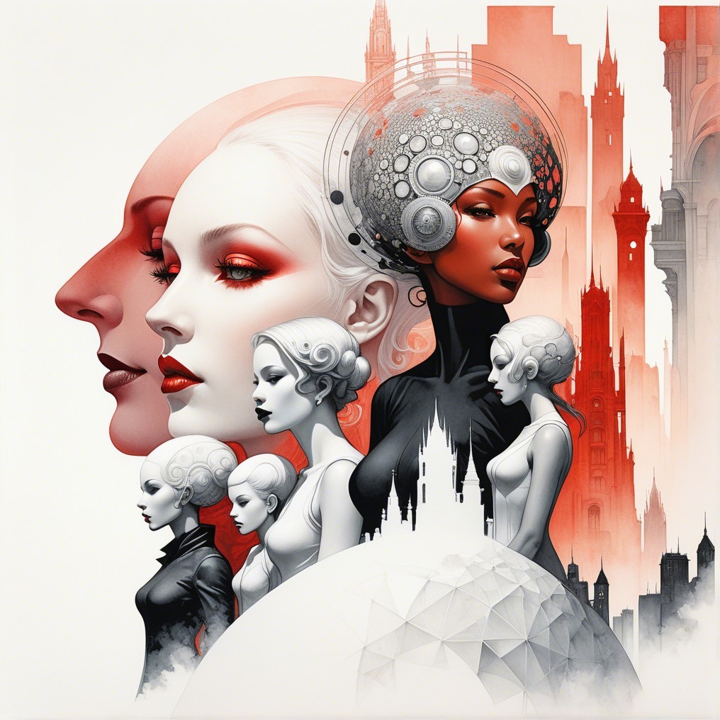 The image features stylized, contrasting profiles of women in red and black, set against a backdrop of intricate architecture. It emphasizes themes of elegance, duality, and strength.
