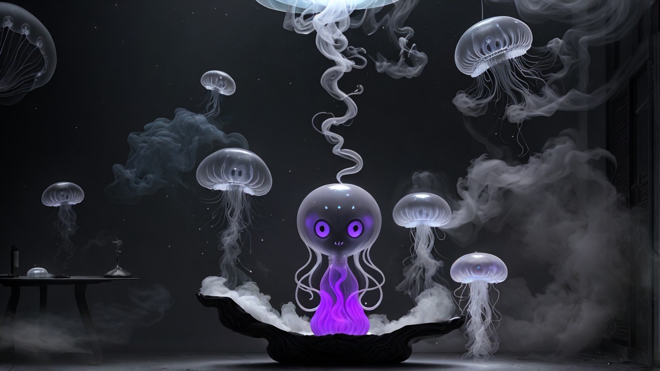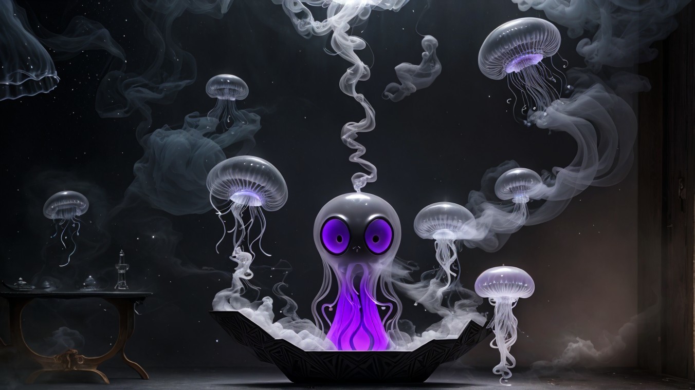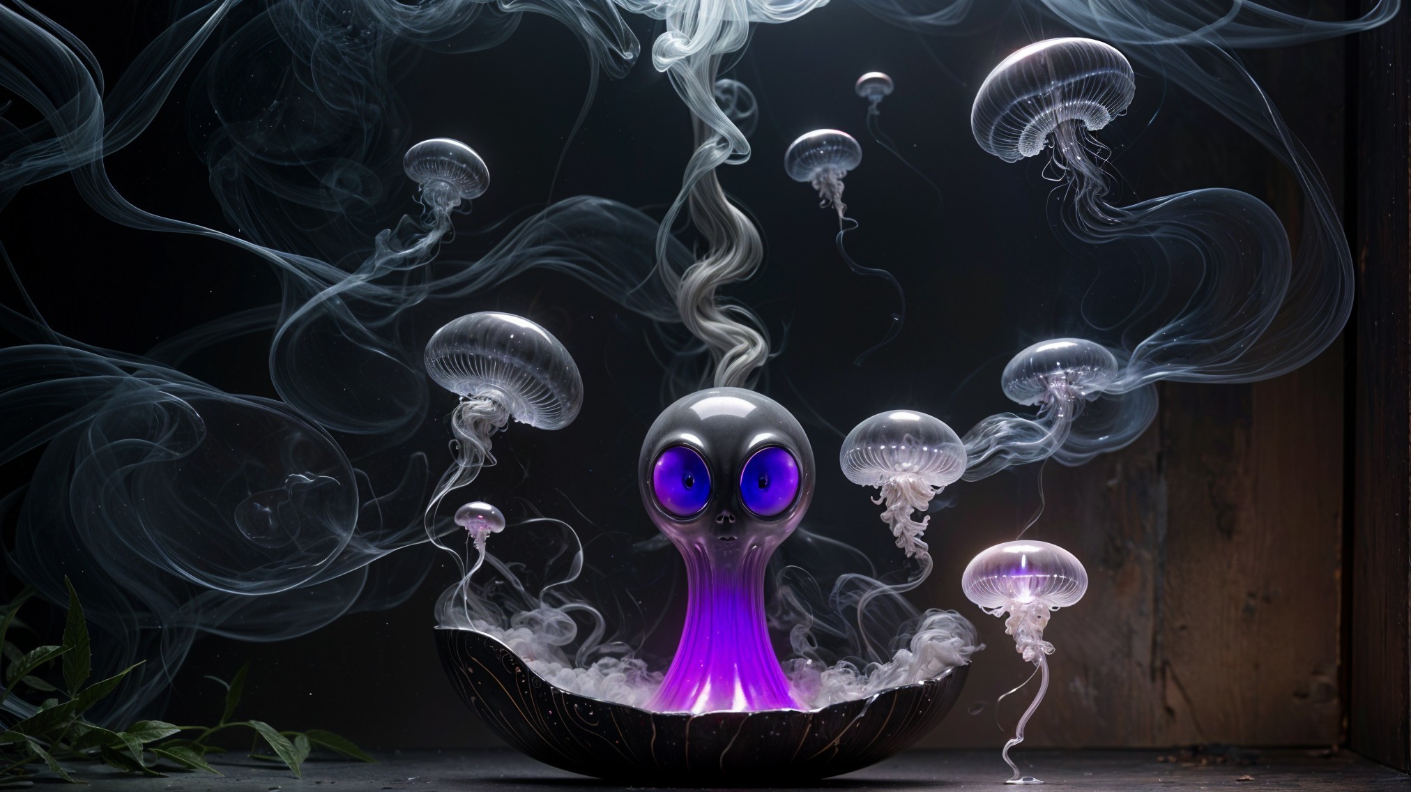 Surreal artwork with jellyfish-like figures floating, a humanoid figure among them with a serene expression, in a mystical, smoky ambiance.