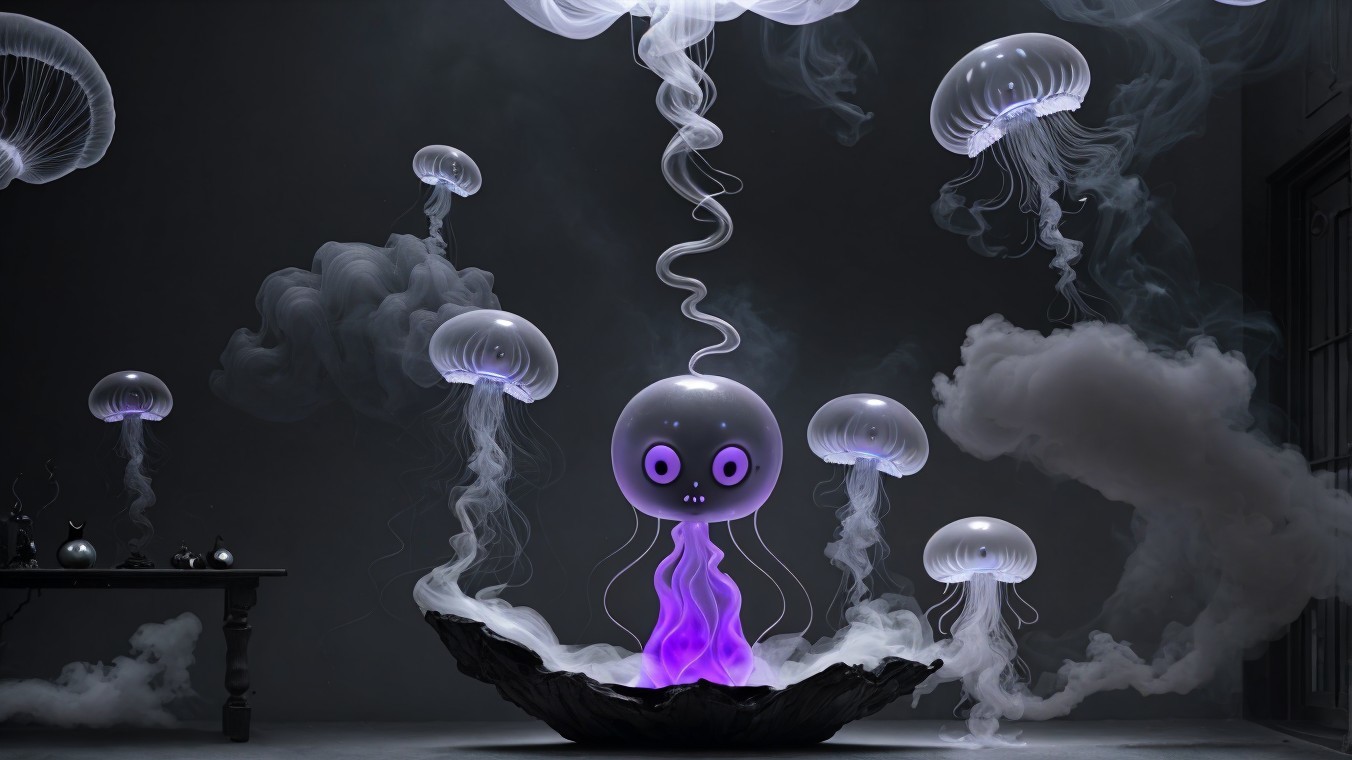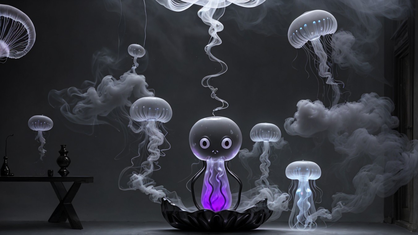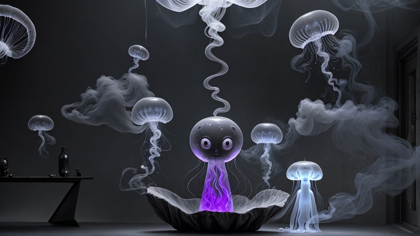 Surreal artwork with jellyfish-like figures floating, a humanoid figure among them with a serene expression, in a mystical, smoky ambiance.