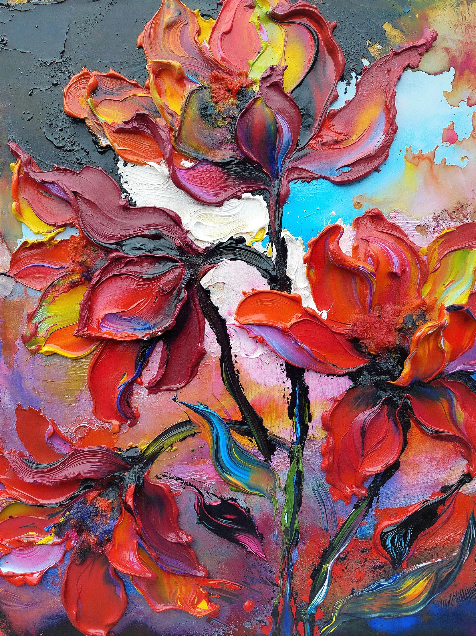 Close-up oil painting of vibrant red flowers. The flowers are comprised of thick impasto strokes of paint, creating a heavily textured surface that stands out from the canvas. The petals display a range of red hues, from bright scarlet to deep maroon, with hints of yellow, orange, blue, and