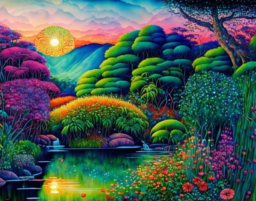 A vibrant, colorful artwork depicting a lush, magical landscape with a radiant sunrise, blooming flowers, and a tranquil pond.