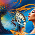 The artwork features a striking woman with flowing blue hair, vibrant colors, and abstract patterns blending into a cosmic background, evoking a sense of beauty and imagination.