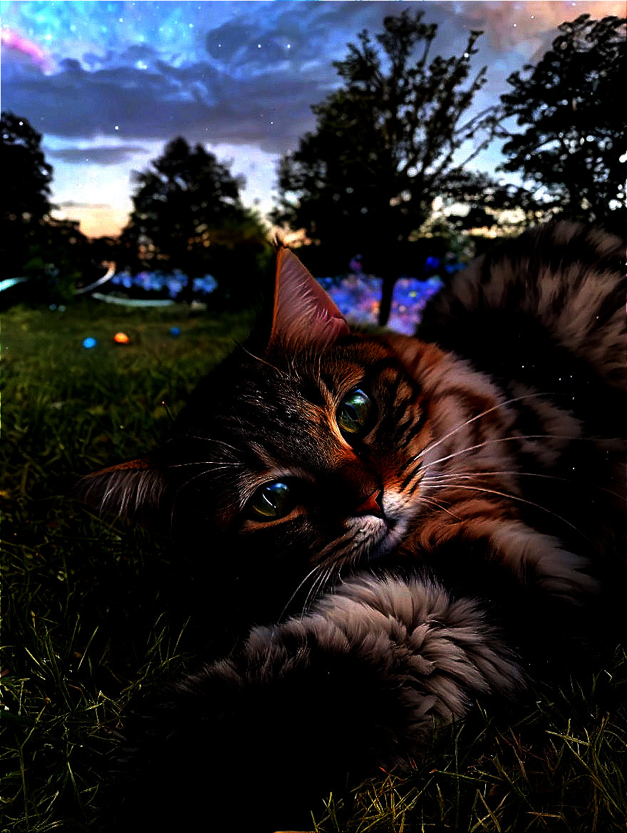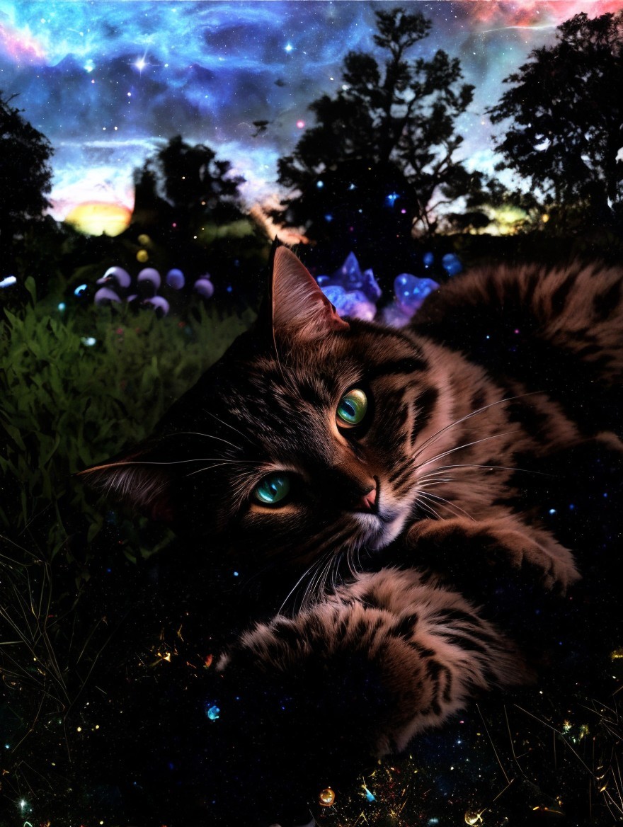 A serene tabby cat lounges against a cosmic backdrop, featuring vibrant galaxies and a starry sky, blending nature and the universe in a captivating, dreamlike scene.