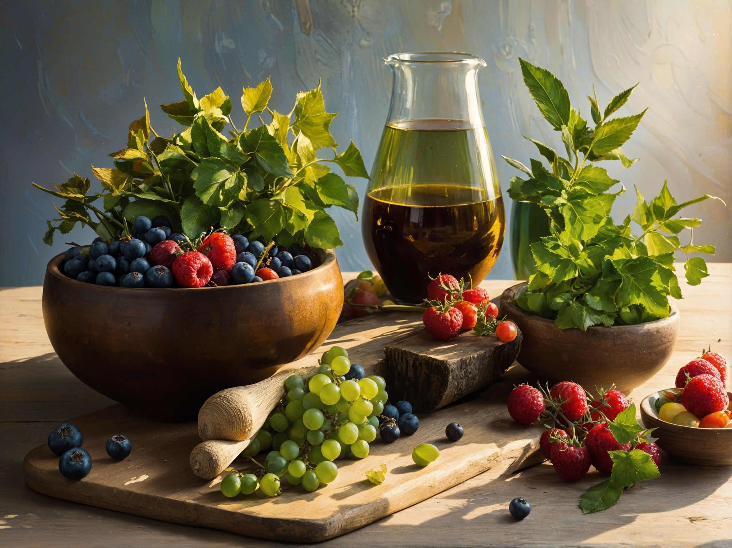 A rustic still life featuring wooden bowls filled with vibrant blueberries, red berries, and green grapes. Fresh leaves complement the arrangement, enhancing the natural, earthy aesthetic.