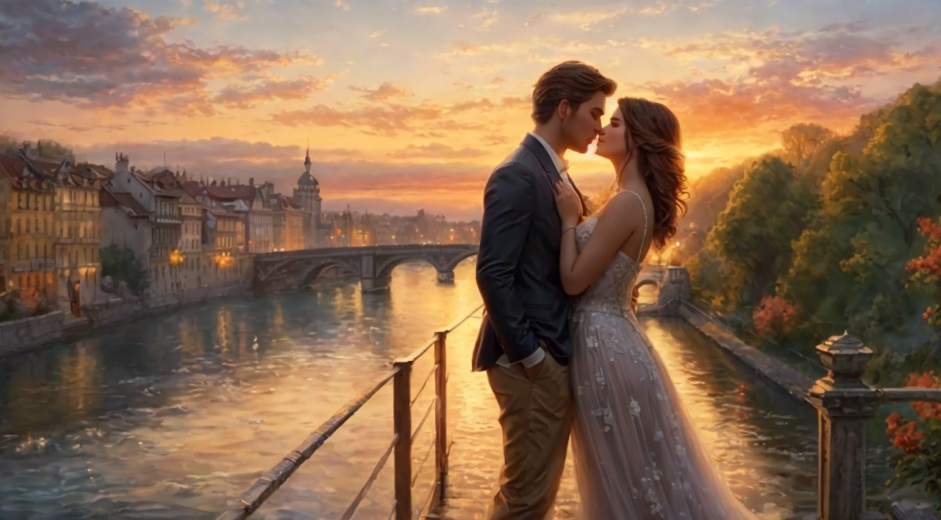 A couple embraces beside a river at sunset, with a picturesque city and bridges in the background.