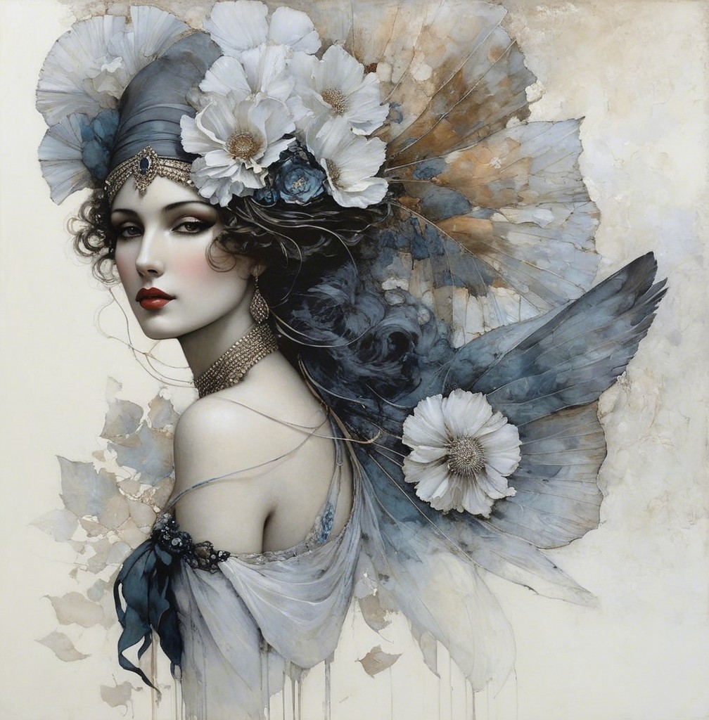 A beautiful figure adorned with an intricate headdress featuring white flowers and feathers, showcasing a blend of elegance and mystery against a soft, muted background.
