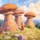 Three giant, mushroom-like structures with orange caps rise from a green landscape under a blue sky. The scene is bright and colorful, evoking a whimsical, fantastical atmosphere.