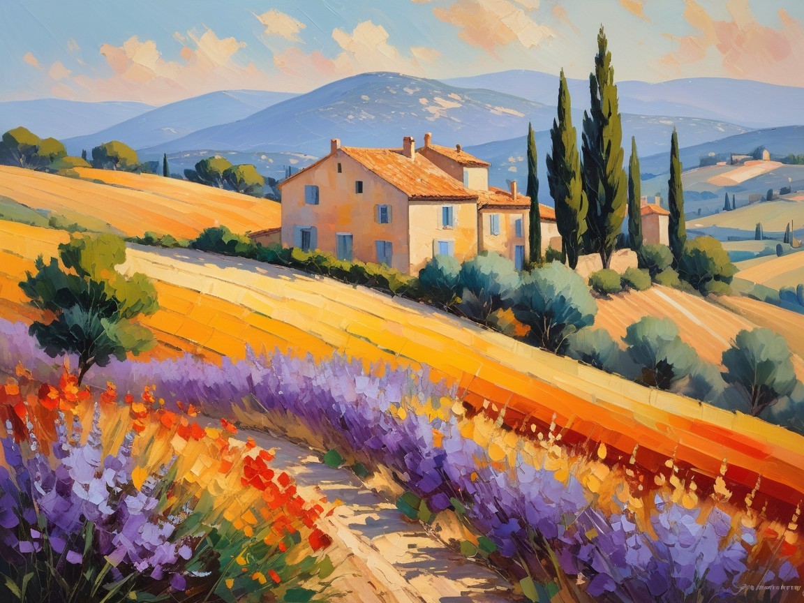 A vibrant, impressionistic painting captures a sunny day in Provence, France, with a picturesque landscape filled with rolling hills and fields of colorful flowers. In the foreground, a field of purple lavender blossoms leads into patches of red and orange poppies, creating a rich tapestry of color. A narrow dirt path winds