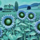 A serene landscape painted in cool tones features stylized sunflowers with blue petals standing tall amidst rolling hills and stylized trees under a softly illuminated sky.