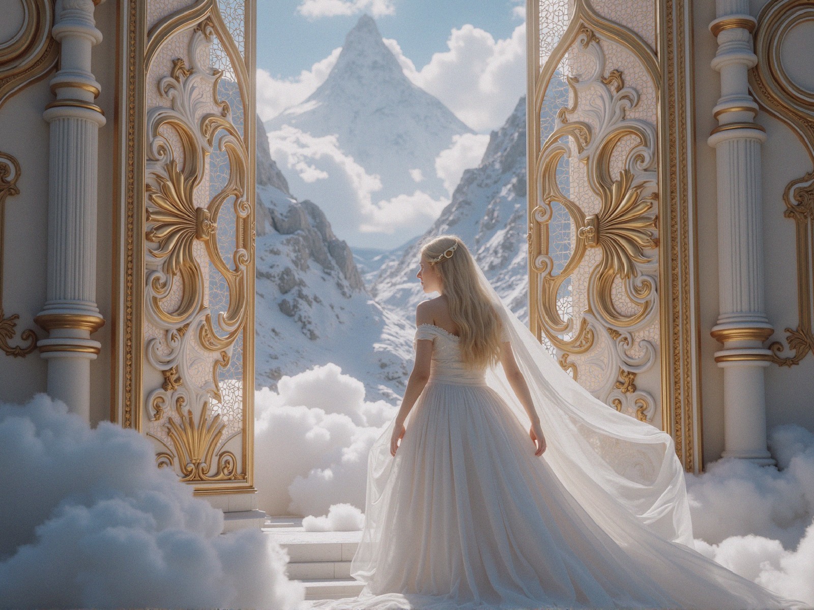 A serene scene shows a woman in a flowing white gown and veil, standing before ornate golden doors that open to a stunning snow-capped mountain landscape, surrounded by soft clouds.