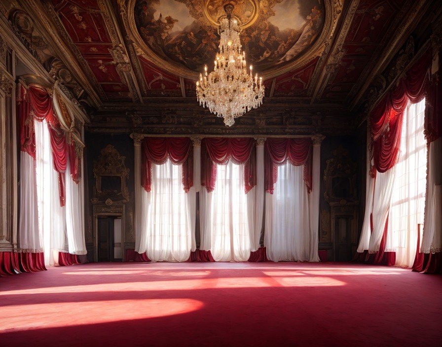 Opulent room with red floors, grand chandeliers, and billowing white curtains basking in warm sunlight.